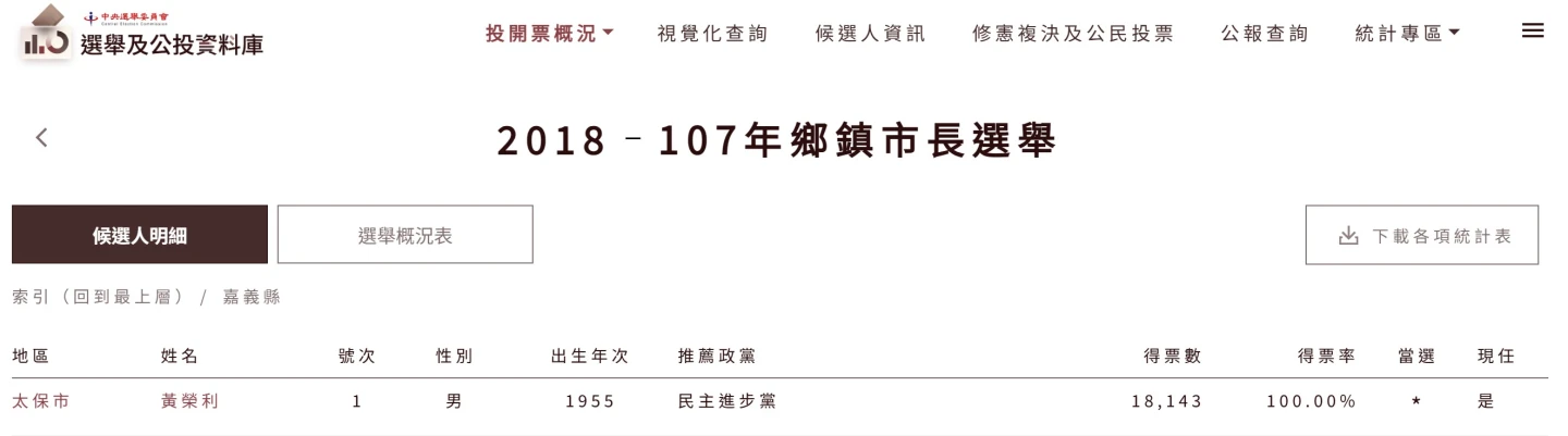 依據中選會選舉資料庫,2018ー107年鄉鎮市長選舉得票數統計,黃榮利是1955年次。