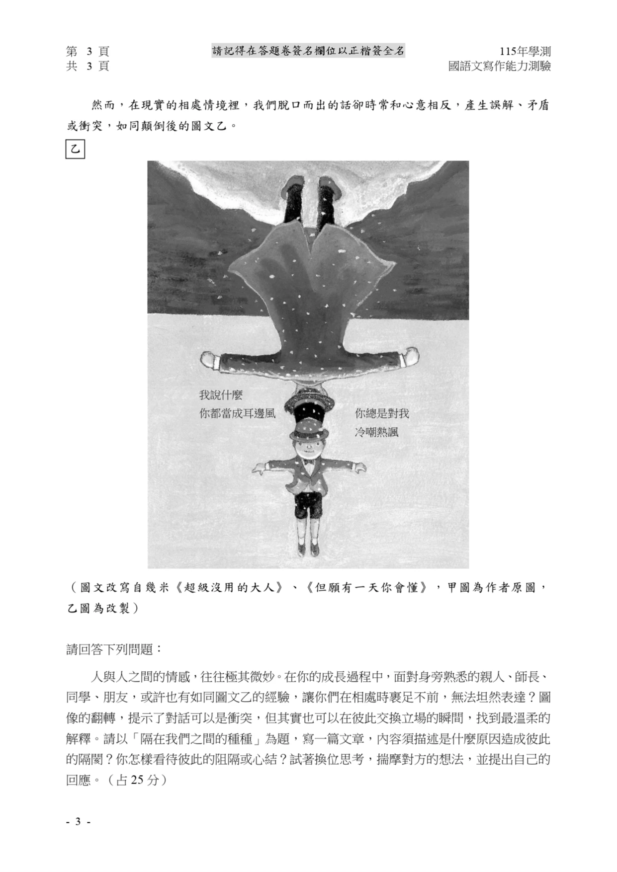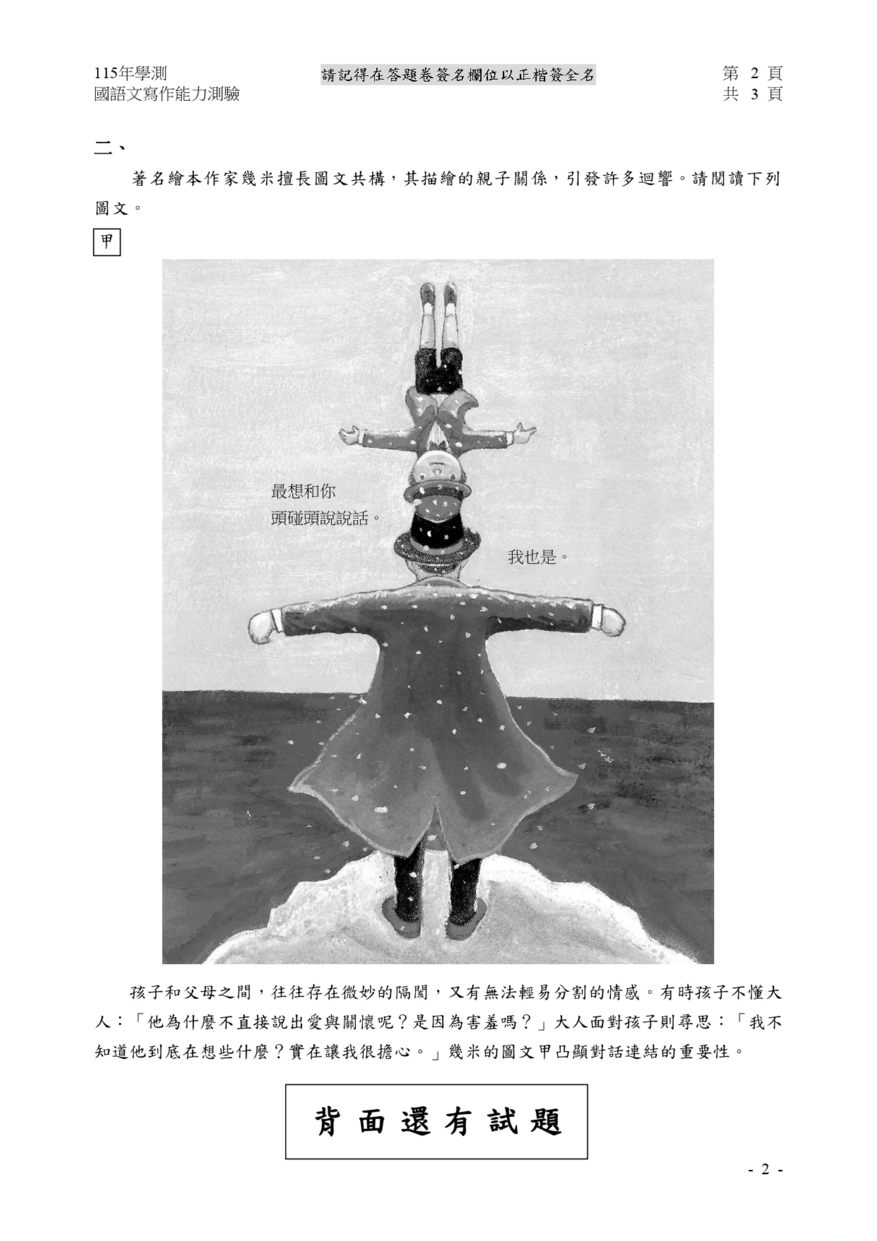 國寫第二大題情意題放上繪本作家吉米的圖文,以及修改過的圖文,描繪親子關係,談及親子之間往往有微妙隔閡,以及無法輕易分割的情感,但現實中相處時,卻又常常脫口說出與心意相反的話,因而產生誤解、矛盾或衝突,要求考生以「隔在我們之間的種種」為題,描述人與人之間情感的隔閡,且要揣摩對方想法、提出自己的回應。