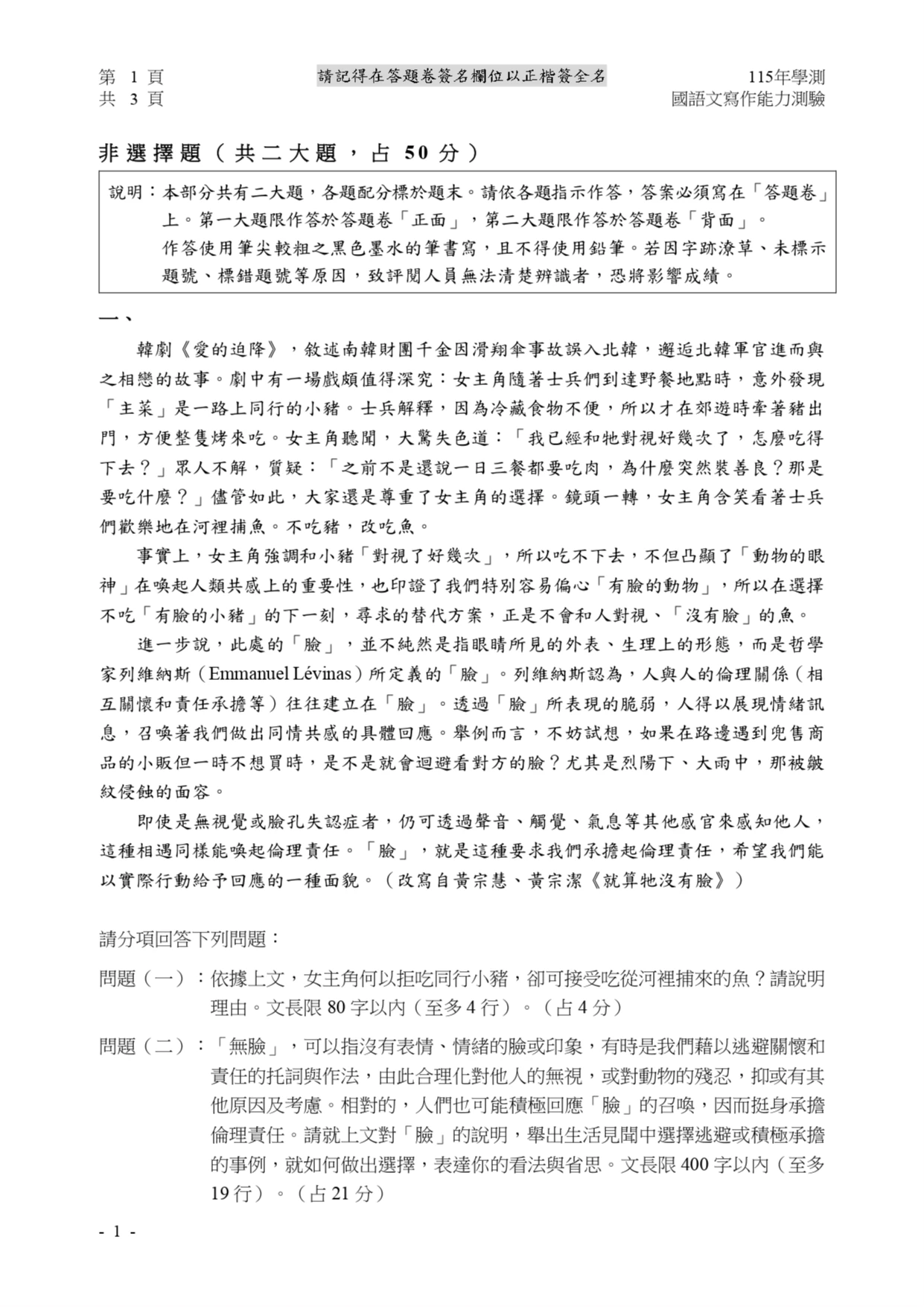 學測國文寫作第一大題知性題,引述《就算牠沒有臉》一書中的片段,以韓劇《愛的迫降》當中,女主角隨著士兵到達野餐地點時,因曾和一路同行的小豬對視好幾次,所以無法吃下該隻小豬做成的「主菜」,並藉此談到,人與人的倫理關係往往建立在「臉」,且指的是哲學上的「臉」。試題要求考生回答,為何女主角不願吃豬,卻接受吃合理捕的魚,以及引導考生舉出生活見聞中,選擇逃避或積極承擔的事例,並表達看法與省思。