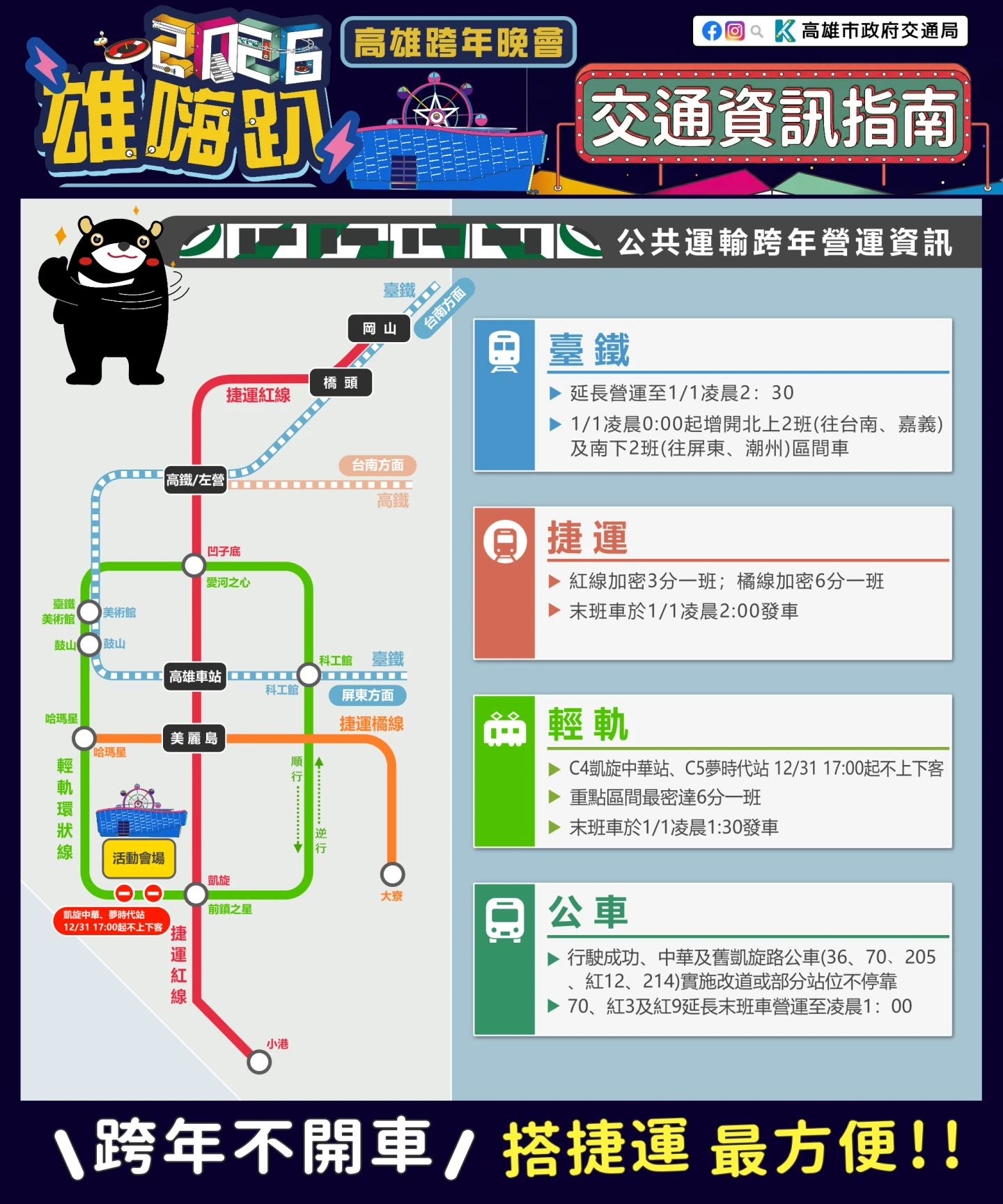 配合散場,捷運及輕軌延長營運時間,捷運營運至凌晨2時,輕軌營運至凌晨1時30分,另台鐵亦加開列車疏運,交通局提醒市民朋友多加利用。