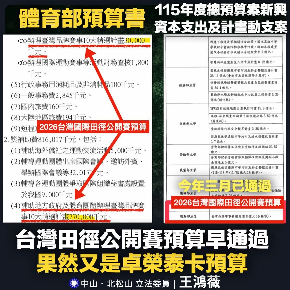 【記者於維奕/綜合報導】中華民國田徑協會日前無預警宣佈停辦「台灣田徑公開賽」,引發外界關注。輿論矛頭指向「在野黨卡總預算」,召來諸多批評。對此,國民黨立委王鴻薇今(10)日於臉書發文反駁,指稱該筆預算立法院早在今年3月初就已通過,現在賽事辦不成,完全是行政院長卓榮泰不願動支預算,刻意進行政治操作。
