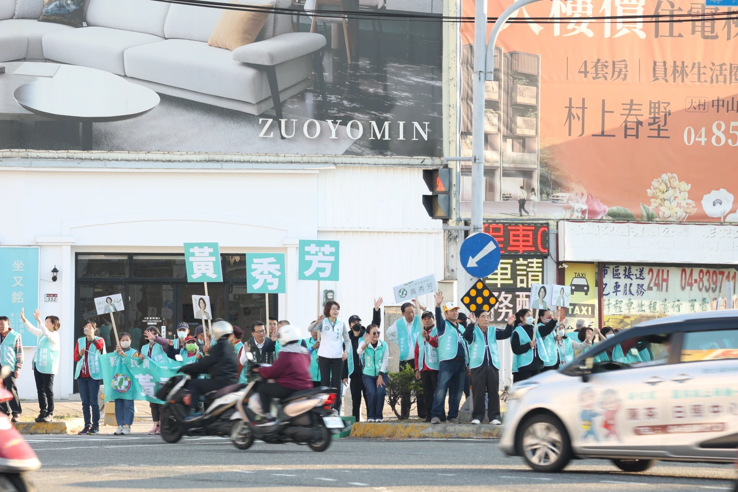 黃秀芳率團隊展開全線站路口衝刺,昨天在彰濱工業區站路口懇託市民支持,今天轉往員林市省道台一線,並由縣議員莊陞漢、黃柏瑜領軍站北端、中山路,黃秀芳則領軍站南端、中山路與員林大道四段、五段及莒光路的五叉路口,南北同步大拜票。