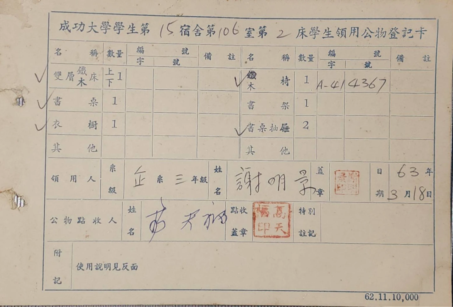 謝明景為成大企管系64級校友,協助弟弟創立知名行李箱大廠「萬國通路」,在畢業近50年後,日前帶著一張泛黃住宿登記卡回到母校。他表示,這一張代表著一筆民國63年(西元1974年)未繳的450元宿舍費,承載青春歲月的回憶,也是心中最惦記的一件事。
