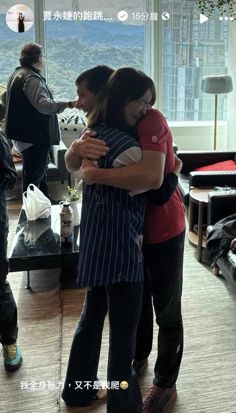 而霍諾德歷經1小時31分鐘奮戰登頂瞬間,賈永婕在臉書限時動態中分享了她「現場觀戰」狀況,只見她難掩激動情緒振臂吶喊「耶~」,並在動態中寫道:「我全身無力,又不是我爬😭」,並且激動擁抱完攀的霍諾德,配上感動哭泣的表情符號,真實流露出身為主辦方與現場觀眾的緊繃心情。