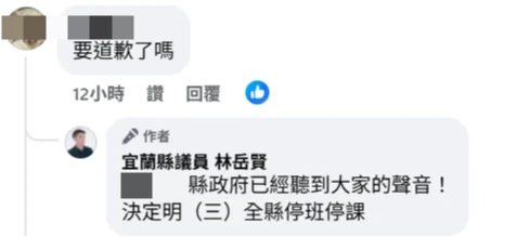 網友怒轟「議員造成民眾的困擾」、「要道歉了嗎?」宜蘭縣議員林岳賢則回應,「縣政府已經聽到大家的聲音!決定(周三)全縣停班停課。」另有人在宜蘭縣府粉專留言,要求「管管那些未透過縣政府就自行宣布的民代鄉長議員吧⋯⋯他們能代替縣政府發佈這些訊息嗎」、「請嚴查及追責假造圖卡之人」 。