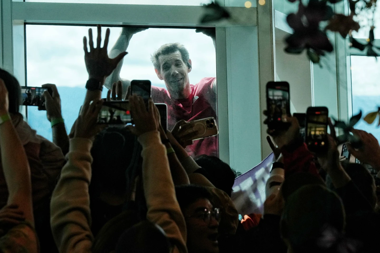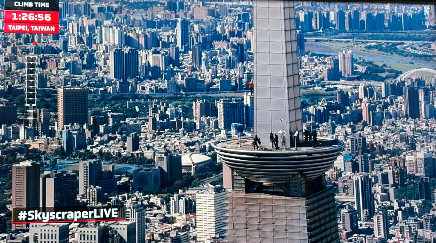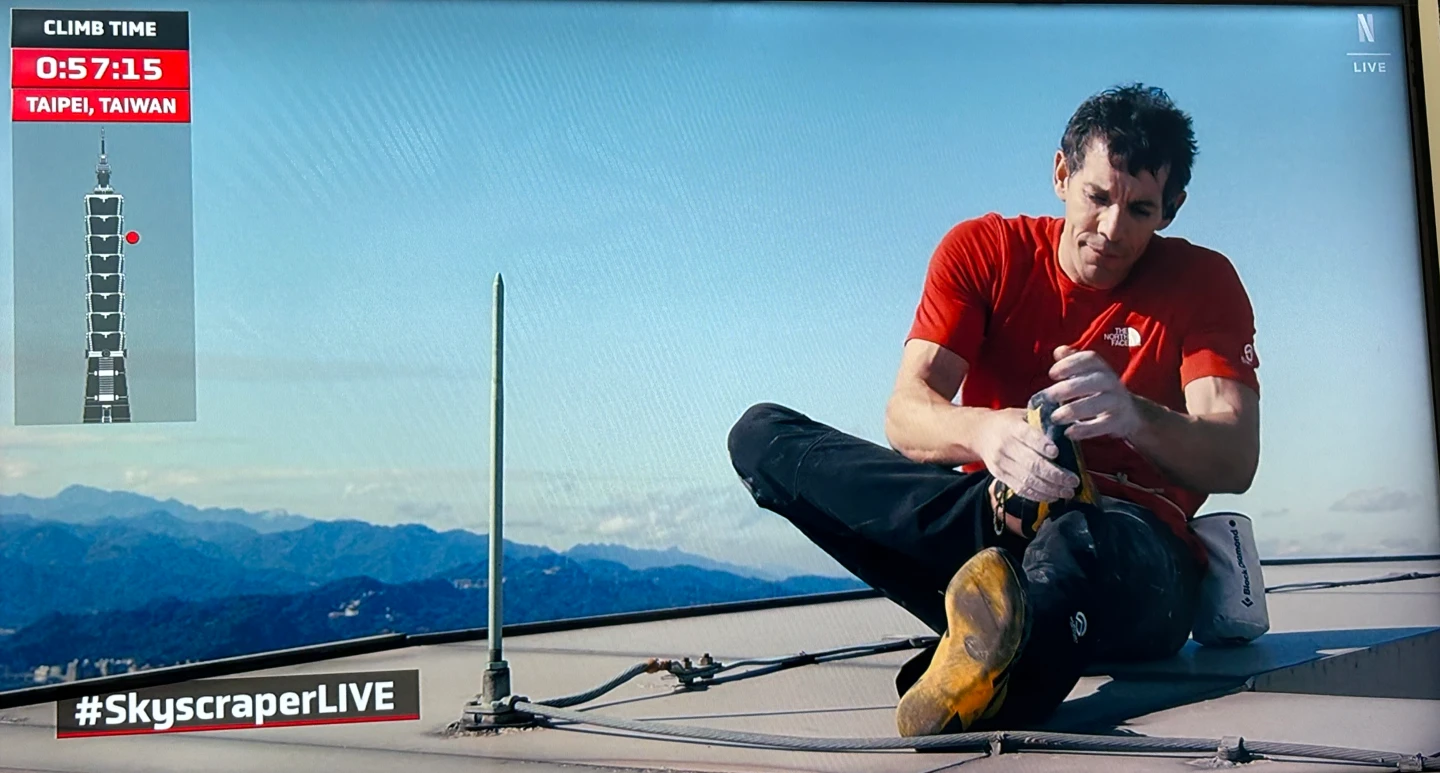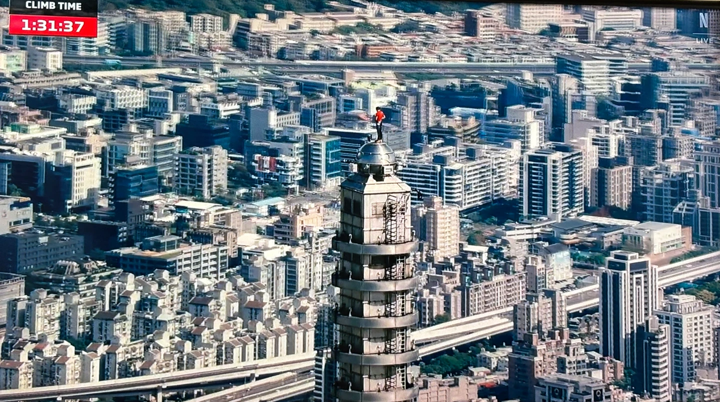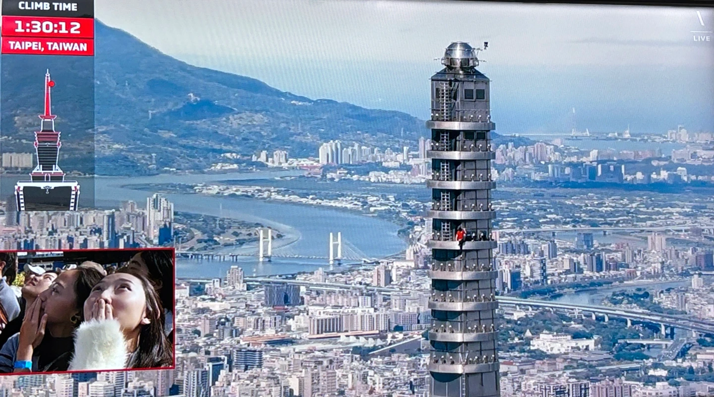 Alex頂著東北季風高樓強風阻力攀爬,全程沒喝水,僅中間一度站在竹節如意邊緣受訪,更低頭往下和現場群眾打招呼,讓Netflix主持人忍不住拜託他往後站,離開邊緣。