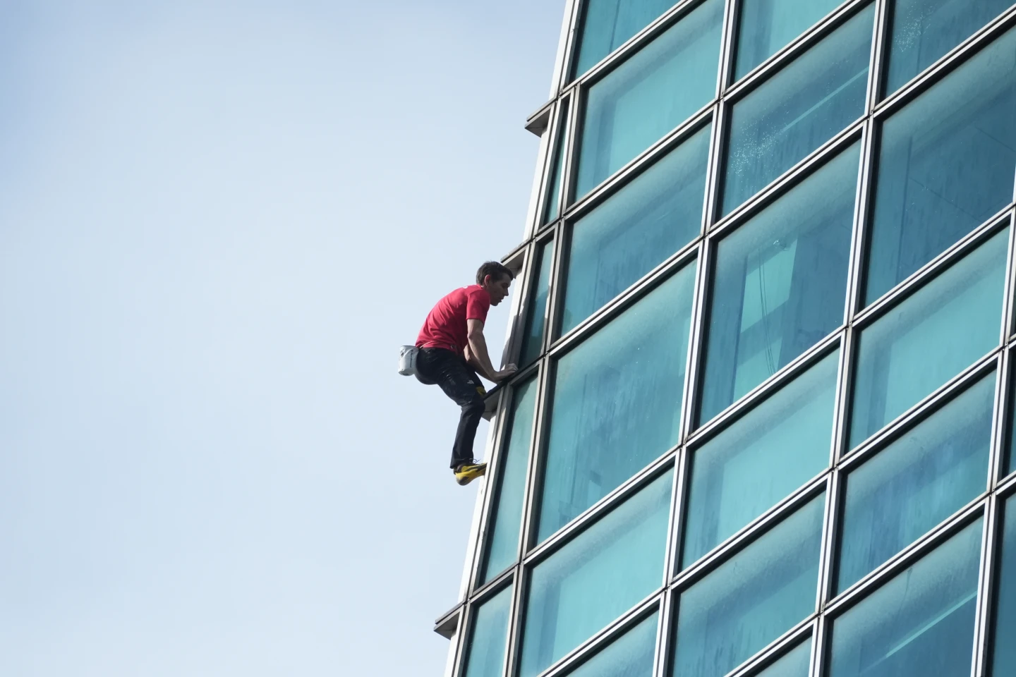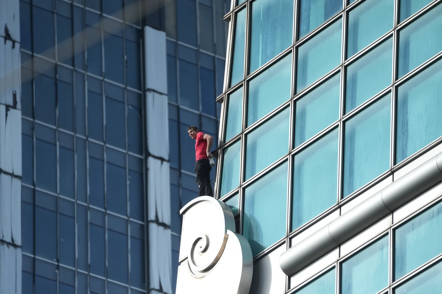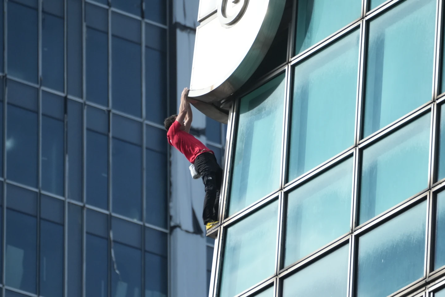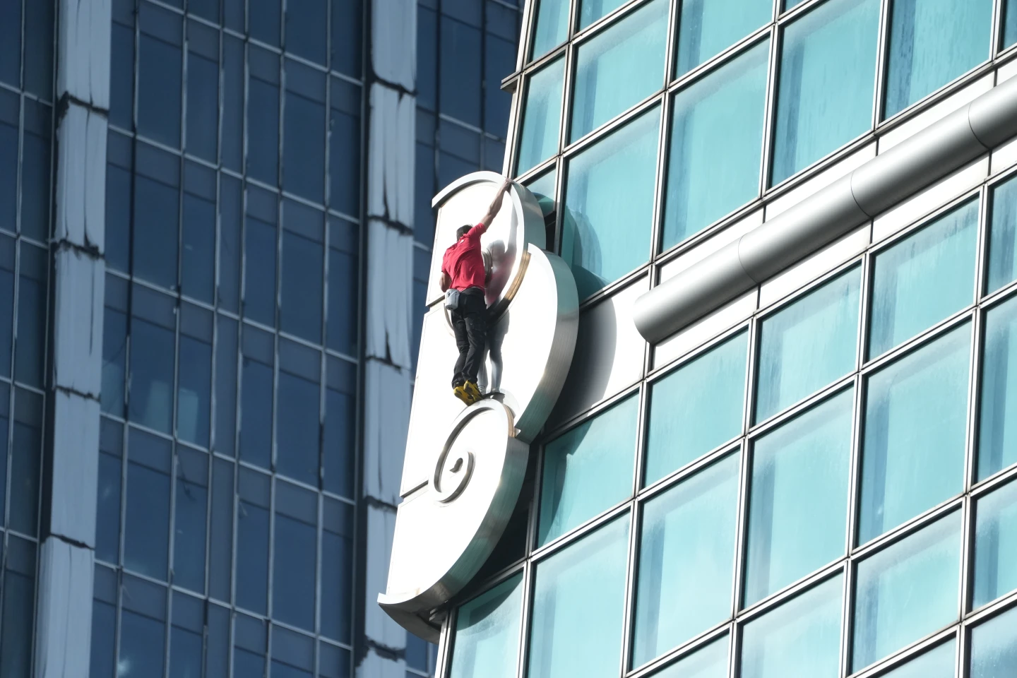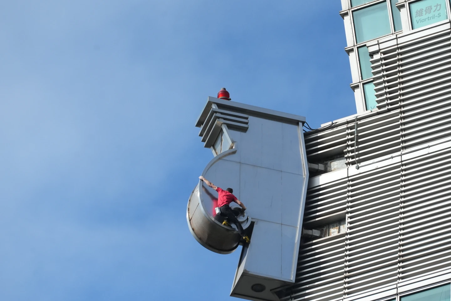 已攻克台北101近八成高度,霍諾德在令人暈眩的400公尺高空罕見地停下節奏。他單手懸掛於窗框邊緣,冷靜地清理鞋底積塵並重新沾滿止滑粉。這短暫的靜止比攀爬更令人屏息,因為在高空強風中,任何微小的濕滑都可能致命。他在雲端稍作調整,以極致的謹慎確保每一寸抓地力,為最後且最艱難的攻頂衝刺做好萬全準備。