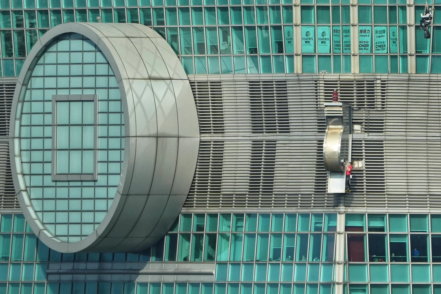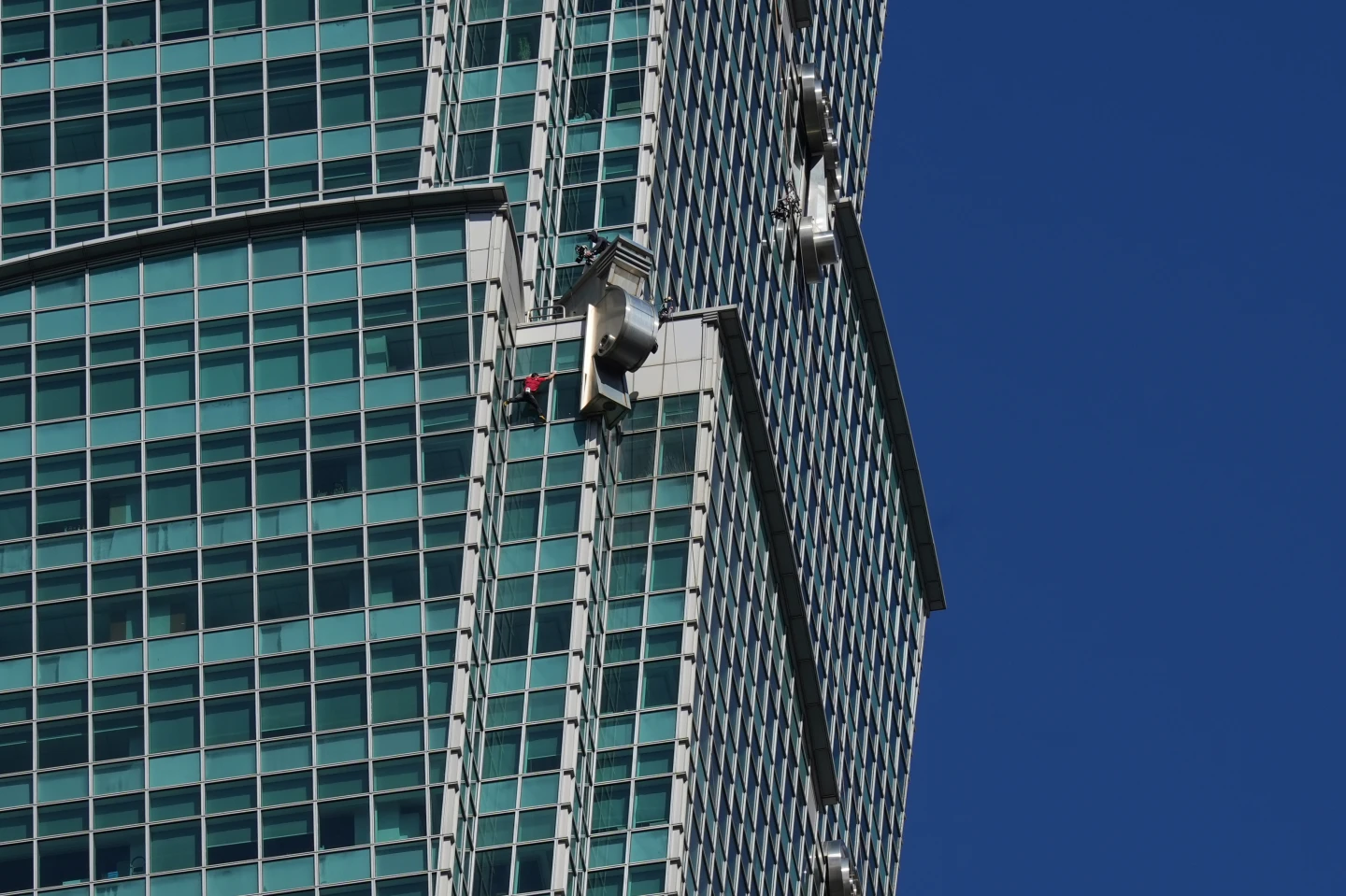接近上午十點,霍諾德已突破101大樓腰身,征服超過50層樓的高度,正式跨越半程里程碑。此刻他懸掛於兩百多公尺的高空之中,腳下的信義區車水馬龍已縮小如模型玩具,令人暈眩。儘管大家認為霍諾德體力持續劇烈消耗,但他的攀爬節奏卻未見絲毫遲疑,呼吸依舊平穩,持續向雲端發起最後衝刺。