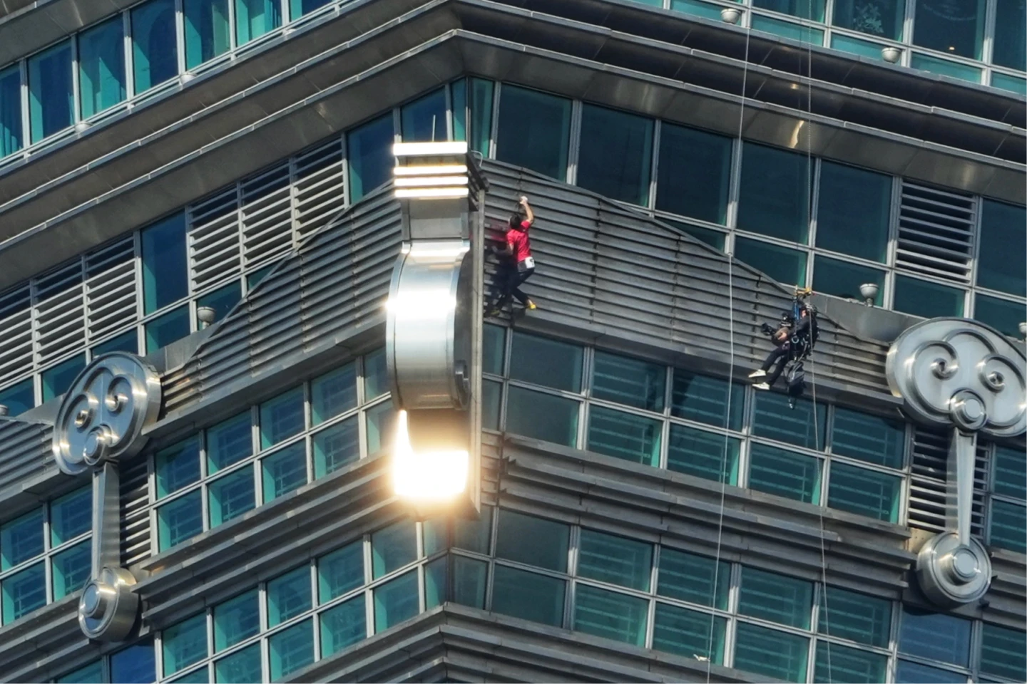 現場觀眾氣氛瞬間凝結,只見他展現驚人的核心力量,在一連串令人心跳停止的擺盪後,精準地翻越這道「反重力」大樓結構天險,驚魂一刻完美詮釋人體極限。而一旁以鋼索垂懸的攝影工作人員,同樣冒著生命危險全程記錄霍諾德的世紀壯舉,令人也為他們捏一把冷汗。