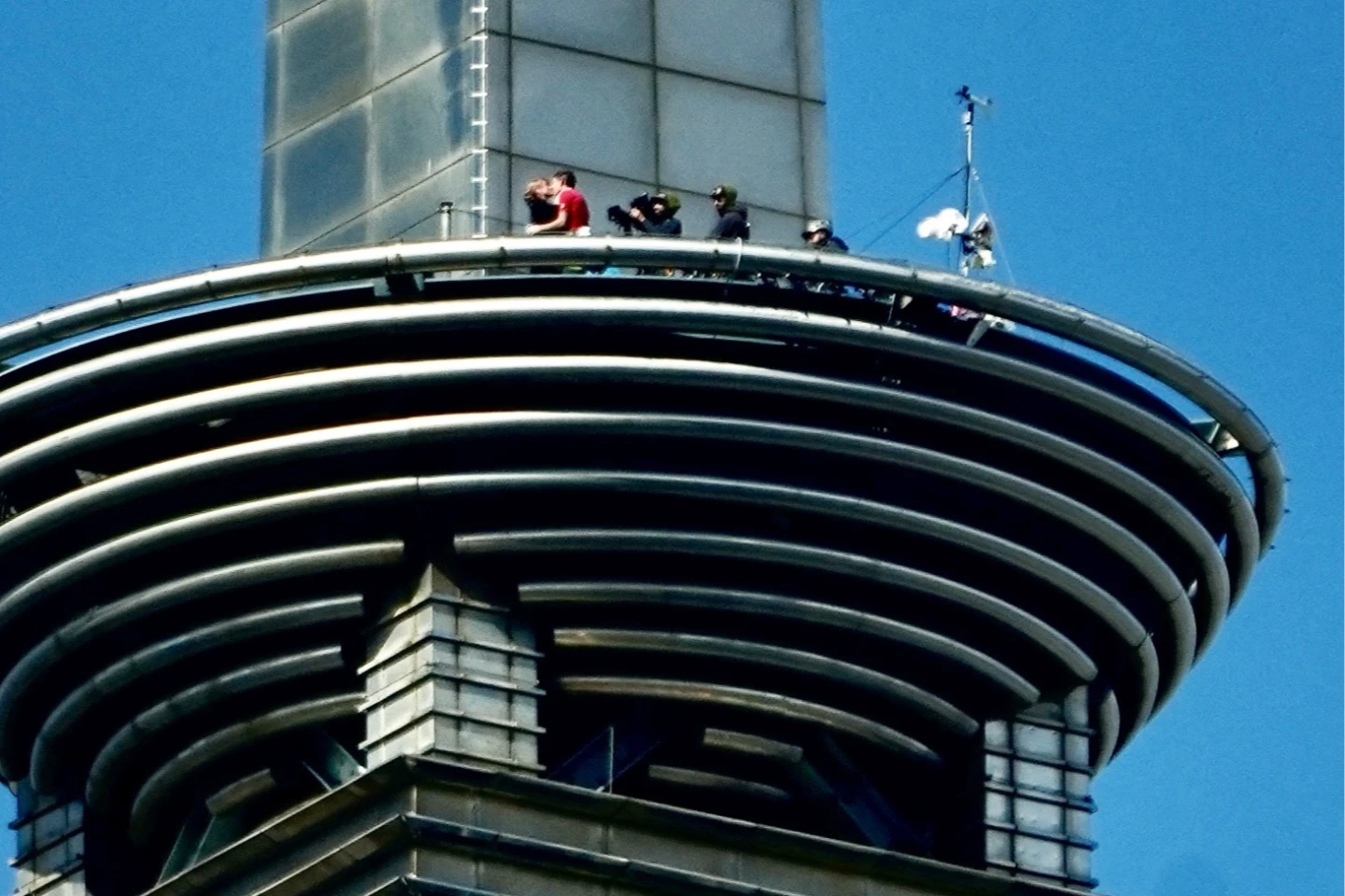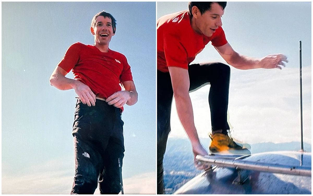 Alex頂著東北季風高樓強風阻力攀爬,全程沒喝水,僅中間一度站在竹節如意邊緣受訪,更低頭往下和現場群眾打招呼,讓Netflix主持人忍不住拜託他往後站,離開邊緣。