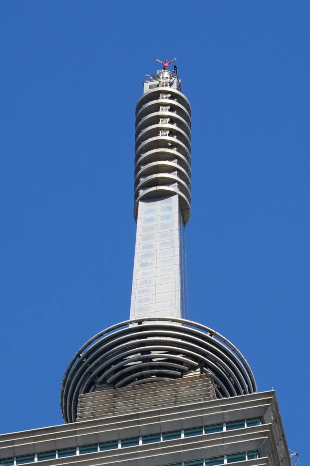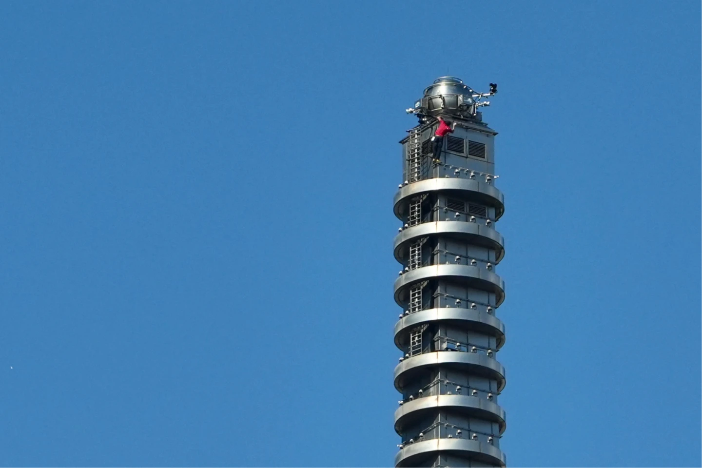 脫離了寬闊的建築主體,霍諾德正式踏上台北101最頂端的尖塔結構。此處已無任何大樓本體遮蔽,他獨自暴露在508公尺的強烈風切中,身形在細長的塔尖上顯得極其渺小。這段垂直的「天梯」是他與天空最近的距離,每一步攀升都在挑戰人類膽識的極限,全世界屏息以待,注視他伸手觸摸天際線的終極瞬間。