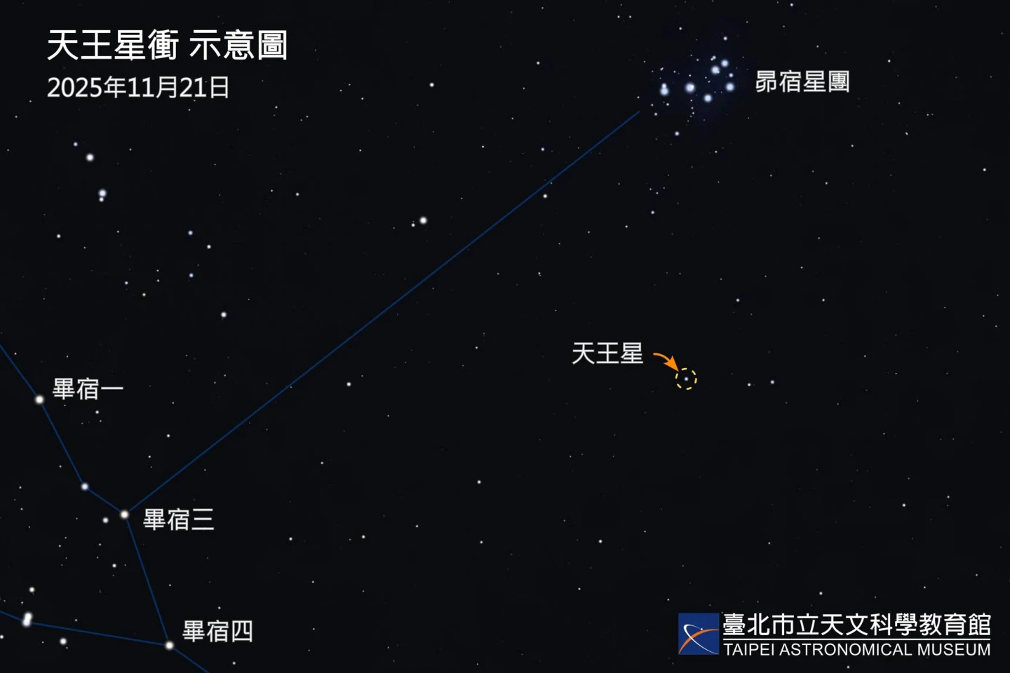 【記者盧麗蓮/綜合報導】今年的「天王星衝」就在今晚!天王星將迎來今年的「衝」,是離地球最近、最亮(約 5.6 等)、整夜可見的最佳觀測時刻,台北市立天文館提醒,只要入夜抬頭往東方金牛座方向,就能一路陪著它到日出前,不過建議用望遠鏡,更能看出它獨特的青綠光。