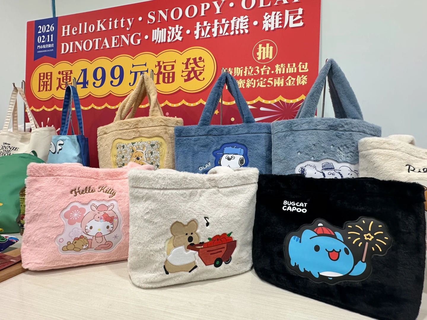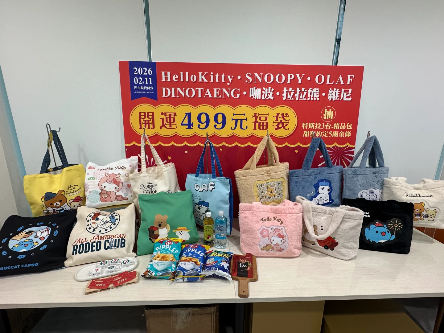 今年更首度加碼推出第二波開運福袋,攜手Hello kitty、Dinotaeng、拉拉熊、貓貓蟲咖波、小熊維尼、SNOOPY、OLAF推出「絨毛托特包」、「雙隔層帆布袋」等2種不同組合的14款499元開運福袋,福袋內除了內附價值360元零食飲料組,更包含1組大獎抽獎序號、合作品牌優惠券外,更搭上時下流行的招牌小燈箱,隨袋附贈7-ELEVEN復古燈箱1個(共5款)與開運福袋發財金卡,最高有機會獲得168元購物金。