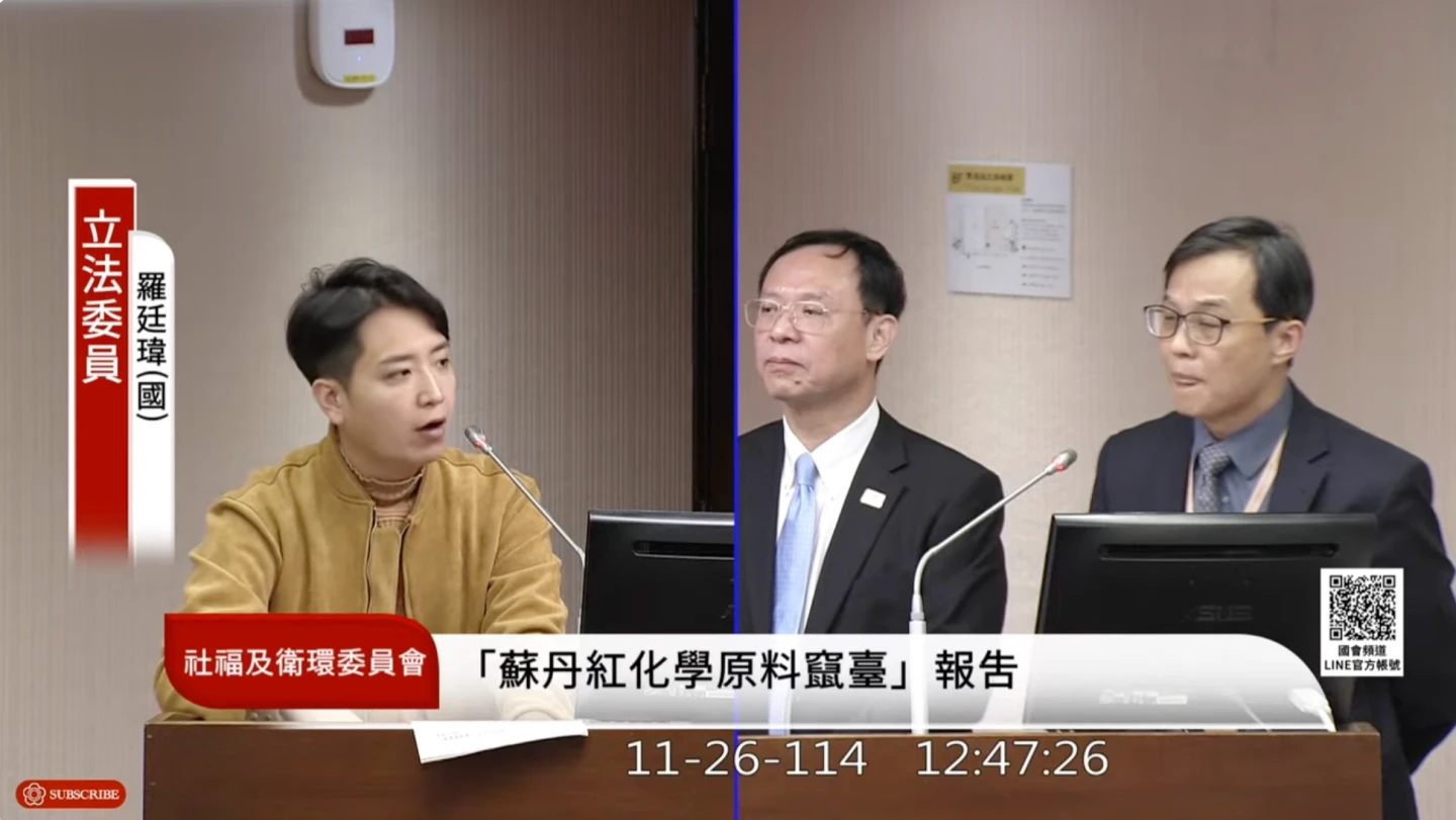 國民黨立委羅廷瑋質疑,進口商是以什麼樣的名目,輸入高濃度禁用色素作為化妝品原料?是否涉及偽造文書?食藥署長姜至剛回應,輸入的名目是其他植物性著色料,當中完全不能有蘇丹紅,檢驗報告也沒有提到蘇丹紅,「有蘇丹紅一定進不來」,目前請檢調協助偵辦。