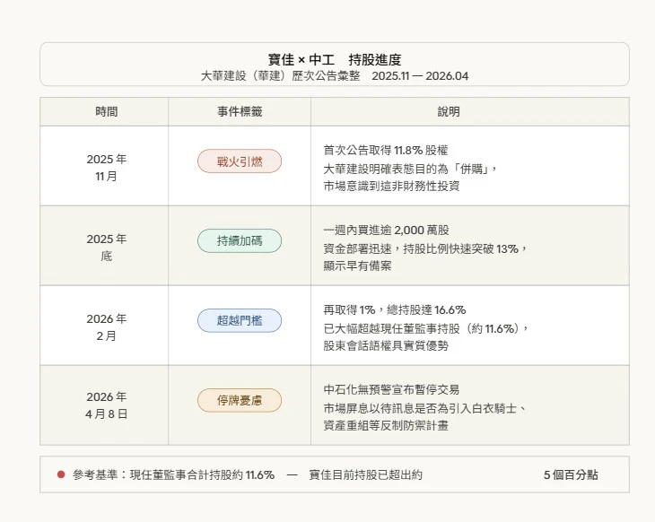 回顧這場經營權之爭,寶佳集團採取的是典型的「槓桿式攻防」。自 2025 年下半年起,寶佳旗下大華建設(華建)開始高調吃下中工股權,截至今年2月底,持股已飆升至 16.6%,超過公司派持股,以寶佳戰略來看,雖然表面上是要拿下中工經營權,但卻是劍指中石化,如果拿下中工,等於拿下中石化。