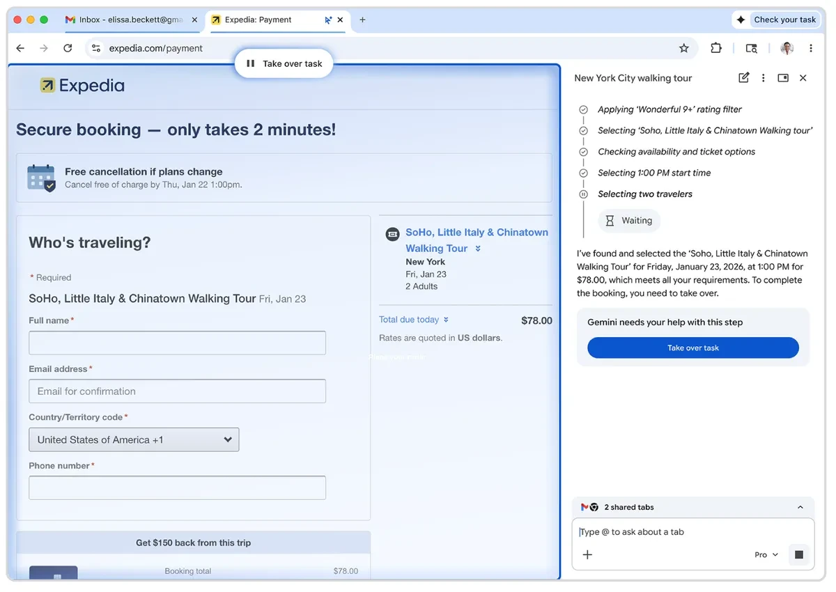 在Google示範中,Chrome產品管理總監德席爾瓦(Charmaine D’Silva) 使用這些新工具規劃家庭旅行,Gemini會比較多個旅遊網站的目的地和價格,查看學校日曆以了解孩子們的假期安排,並協調行程,找到合適的旅行時間。不過,在預訂環節,席爾瓦強調最終的決定和購買權仍然在她手中,這也凸顯Google的理念:在預訂和購買等關鍵任務中,用戶仍然擁有控制權。