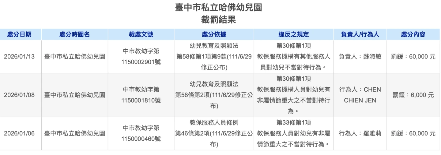 教育局依規對該名教保員開罰最高6萬元、對外師處以6千元罰鍰,並認定園方負有連帶責任,對園所開罰最重6萬元,且已在全國教保資訊網公告行為人姓名及園所「台中市私立哈佛幼兒園」名稱,其中動手教保員已在去年12月離職。
