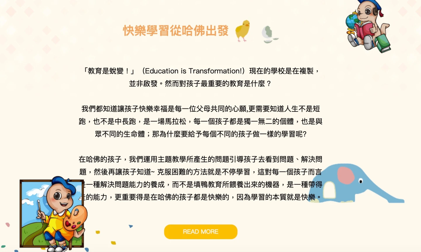 根據哈佛幼兒園在官網以「教育是蛻變!」(Education is Transformation!)作為教育宗旨,強調「現在的學校是在複製,並非啟發。然而對孩子最重要的教育是什麼?我們都知道讓孩子快樂幸福是每一位父母共同的心願,更需要知道人生不是短跑,也不是中長跑,是一場馬拉松,每一個孩子都是獨一無二的個體,也是與眾不同的生命體;那為什麼要給予每個不同的孩子做一樣的學習呢?」