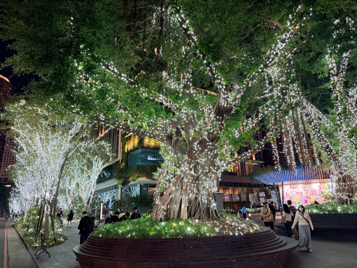 今年勤美草悟聖誕村主打7米高年度主樹「The Sculpted Tree」,以冬日積雪與芬蘭Tykky樹冰為靈感,由藝術團隊「碳矽互動科技」操刀設計,18時至21時整點上演動態飄雪效果,白雪紛飛於草悟道之上,營造夢幻雪國場景。經典地標「光之道 2.0」也再升級,40萬顆銀白燈泡交織成長達250公尺的雪白森林步道,沿著隈研吾設計的綠廊帶一路延伸,構築出台中最具記憶點的冬夜風景。