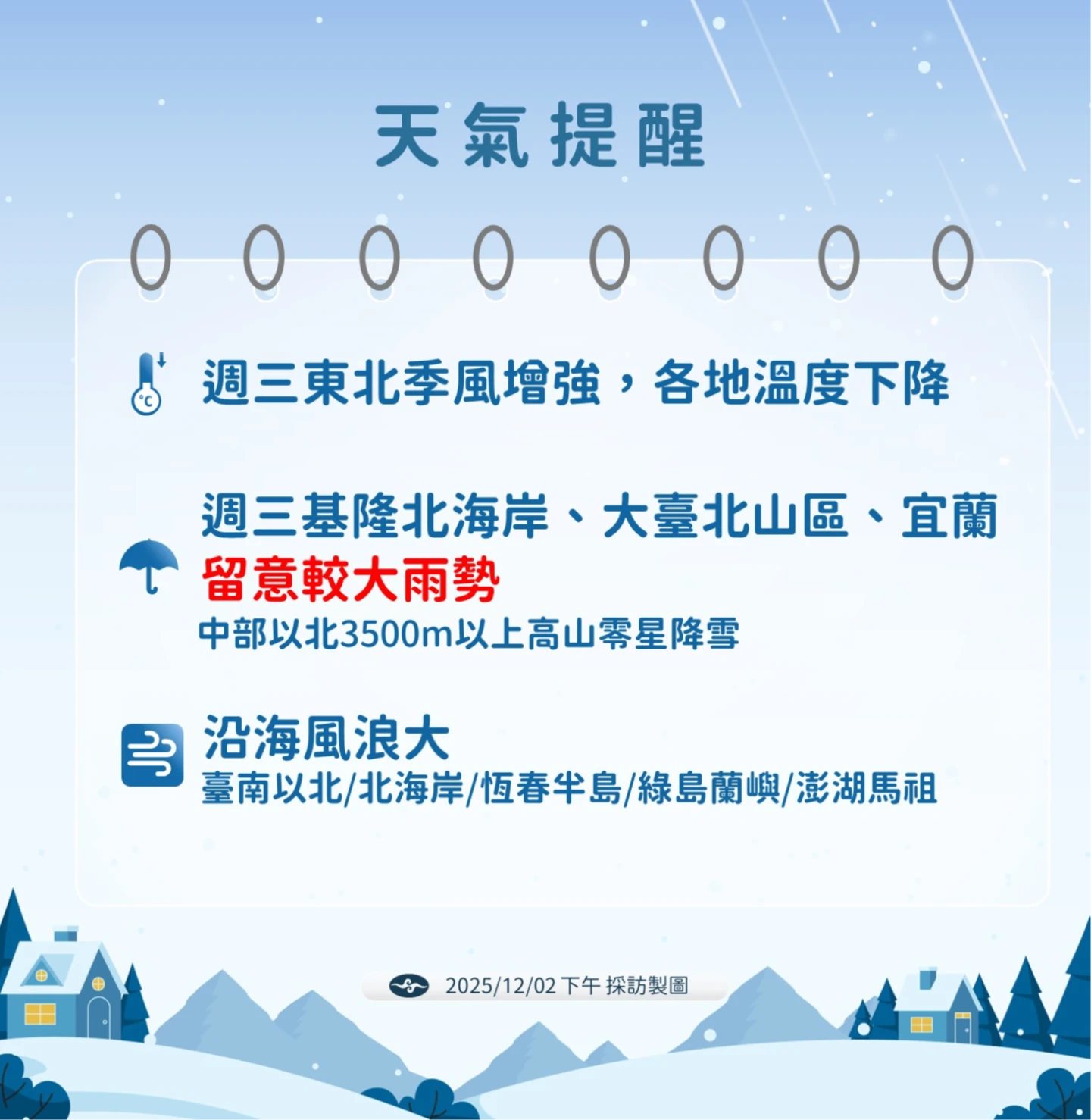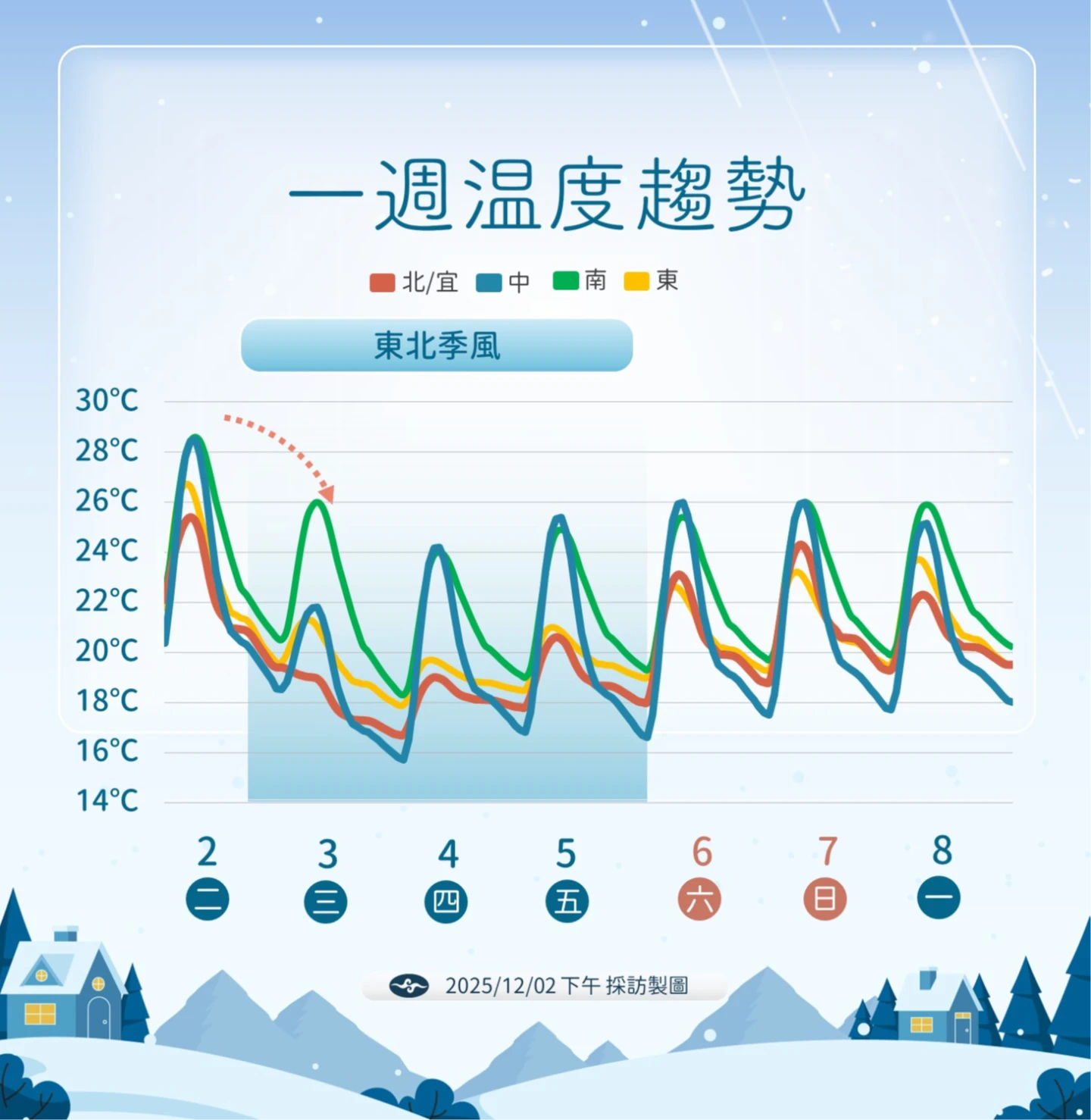 中央社報導,氣象署今日晚間指出,明天開始東北季風挾冷空氣南下,氣溫呈現「愈晚愈冷」的趨勢。中部以北及宜花地區降溫明顯,預計明天上半天溫度仍有約20度,但中午左右將降至18度。
