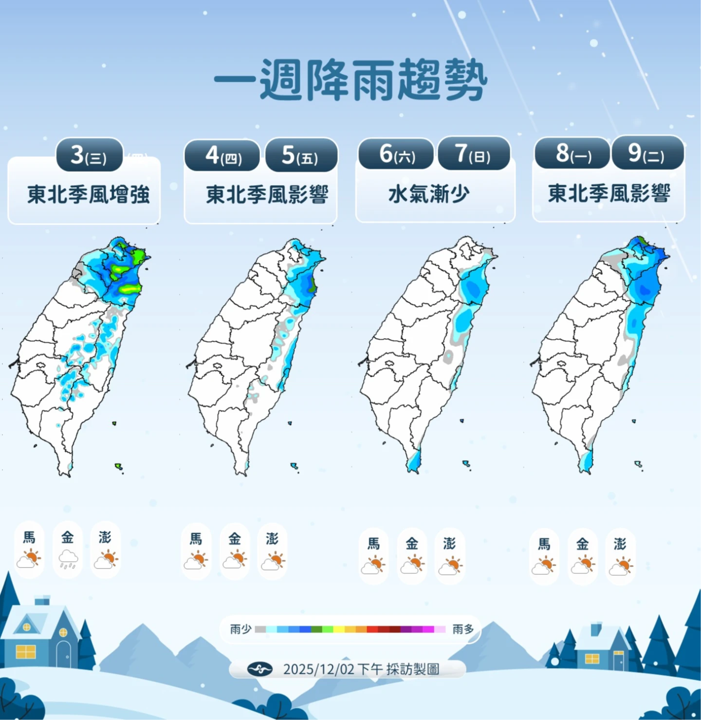 降雨方面,賴欣國指出,明天是水氣最多的一天,北部、東半部有雨,中南部山區也有零星短暫雨。特別提醒基隆北海岸、大台北地區及宜蘭地區要留意有較大雨勢發生的可能。4日、5日水氣將逐漸減少,雨區縮減為桃園以北、東半部、恆春半島的局部短暫雨。