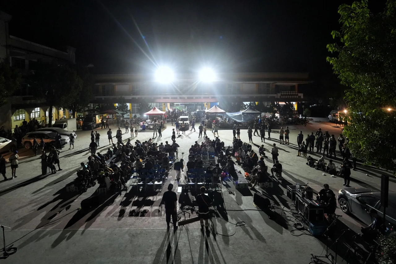 明亮的月光下,歌手演唱著動人歌曲,台下近百人或坐或站,有人專注聆聽演唱,也有人靠在親友身上,表情柔和地互相交談。