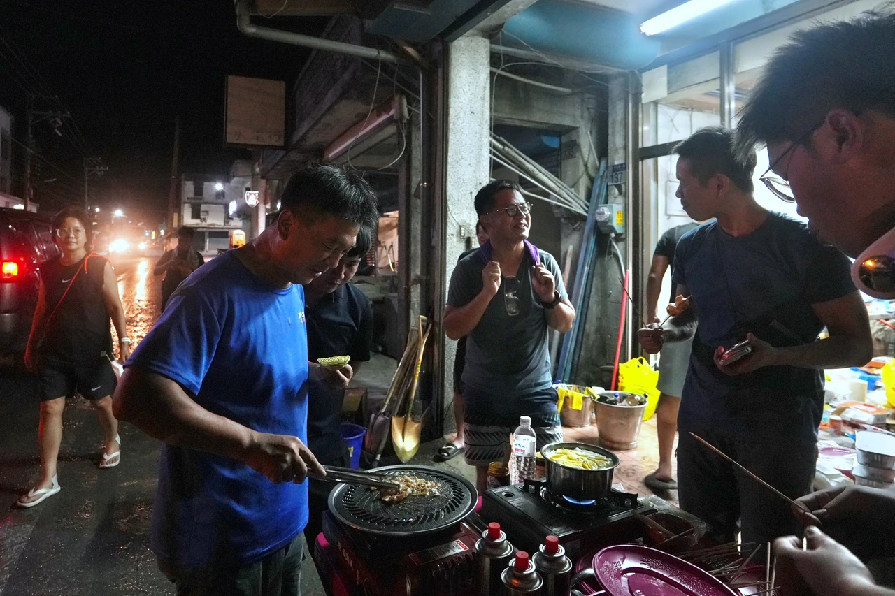 有志工直說,「烤肉才有家的感覺」,這些志工們的烤肉架底下,是仍未完全乾透的泥濘,一群人圍著烤盤上的花枝丸、肉片,吃著災區難得的烤肉,還不忘幫路過的大型機具指揮交通,形成災區夜晚的美好時刻。