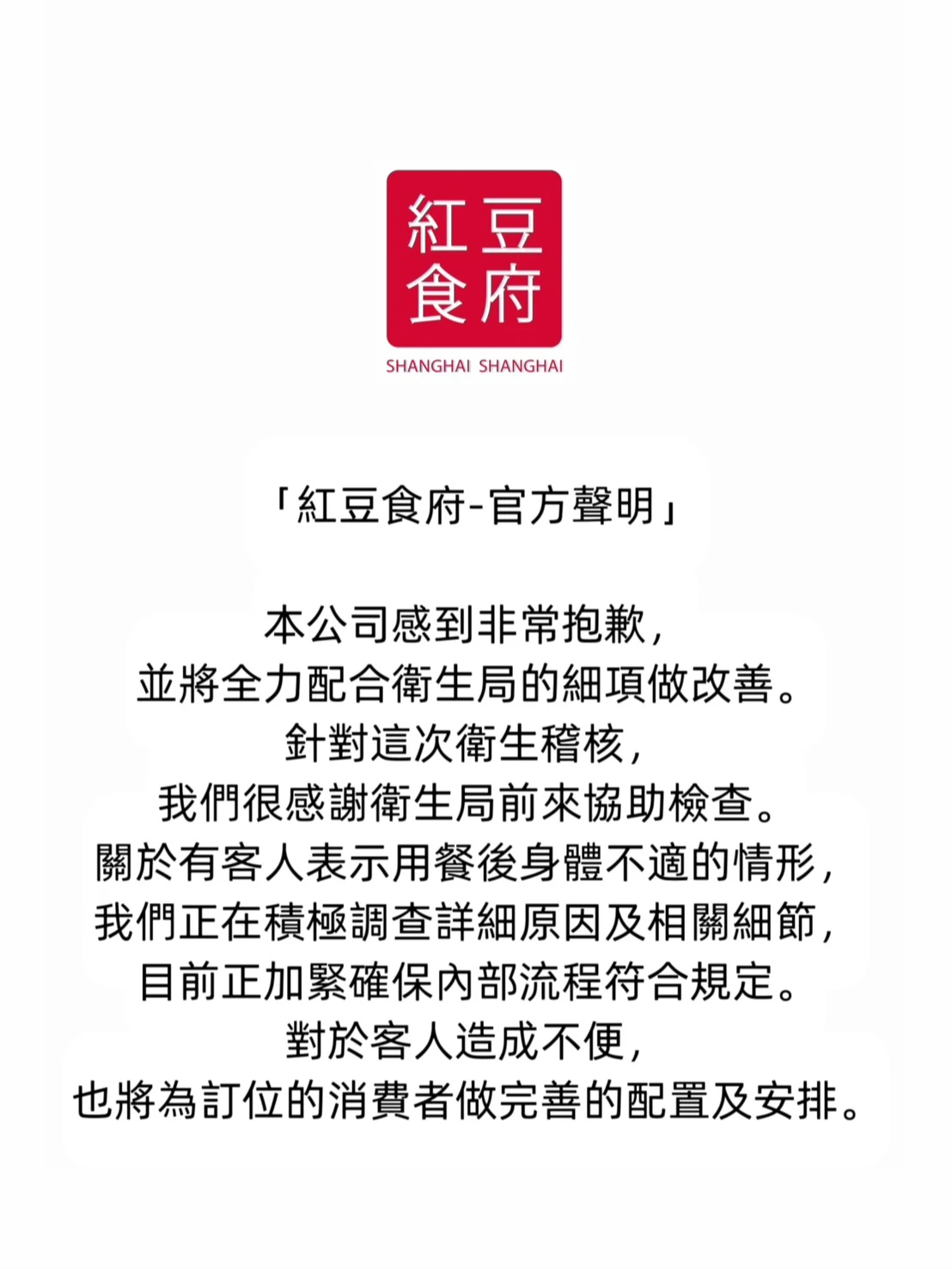 針對本次事件,紅豆食府也發出官方聲明,內容全文如下: