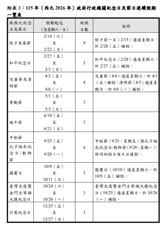 【記者陳力維、陳亮諭/綜合報導】不到一個月,將邁入2026年,據行政院人事總處最新公布的2026年連假行事曆,明年共有9個能夠連休3天以上的假期,其中單一最長連假、農曆春節長假可達9天,若自請4天特休假,將可連成15天超長連假。其他還有可「請1休4」、六段可「請4休10」或休9天長假,最爽請假攻略一次看!