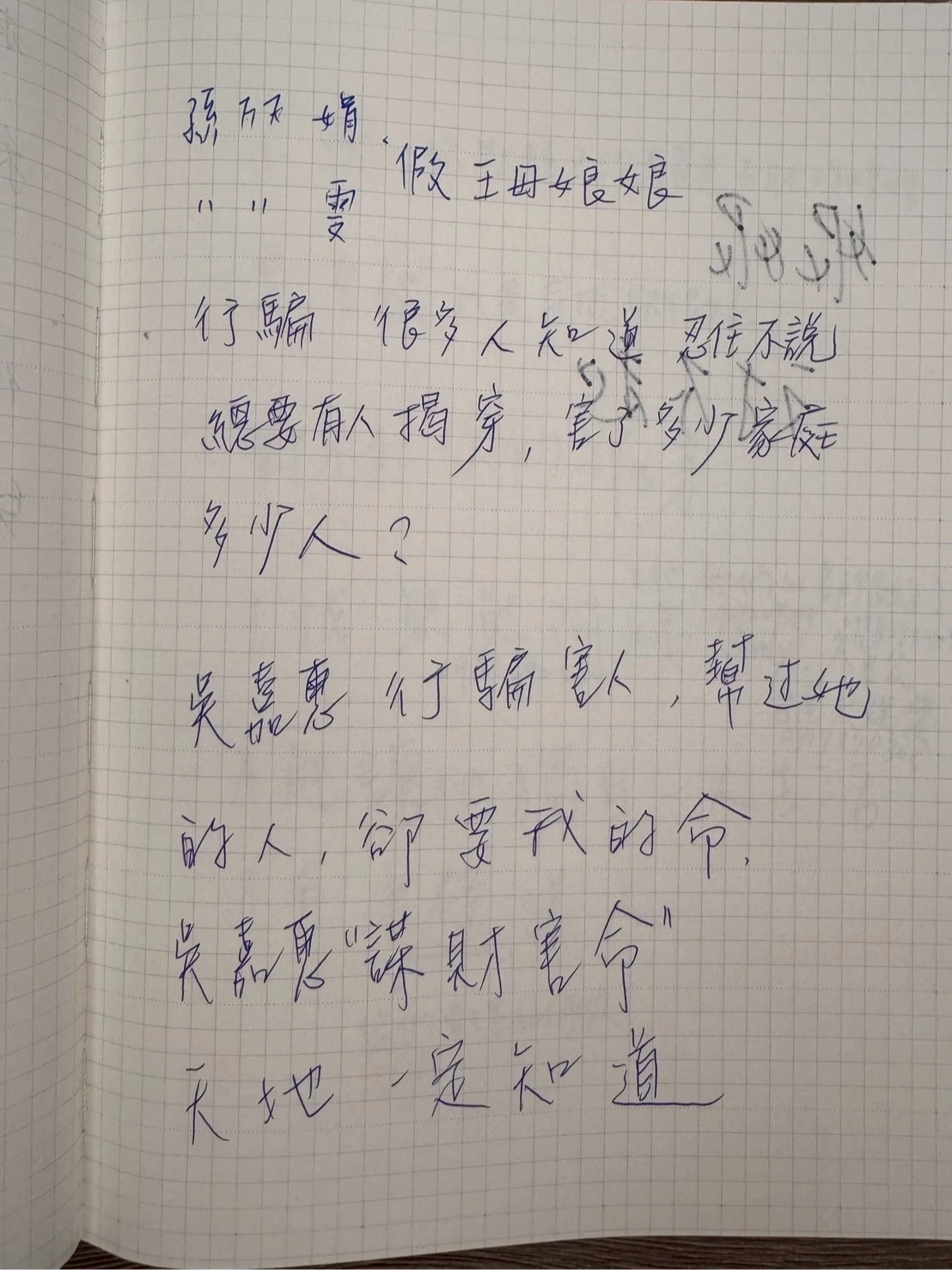 女代書的女兒說,之前母親有去找過孫姓姊妹,但對方「早就不理我們了!」孫氏姐妹都說「母娘會讓大家賺錢」,假借母娘的旨意,要母親幫助吳嘉惠,以累積福報,「如果不幫的話,就會害到你女兒、兒子!」