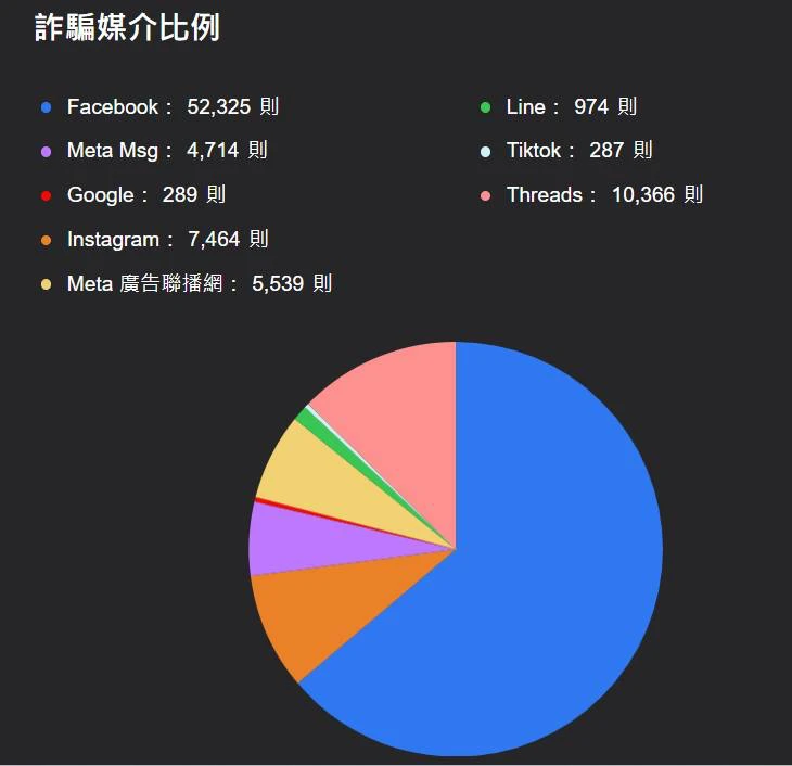 「以打擊詐騙為由封鎖小紅書我沒什麼意見,可是不要雙標。」黃揚明今晚在臉書發文表示,數發部的「網路詐騙通報查詢網」資訊顯示,近30天的通報網路詐騙訊息共7.8萬多則,其中比例最高的是臉書(含Meta訊息)的5.7萬則,佔比超過7成,其次為Thread(約1萬則、13.1%)、IG(約7千則、9.5%),也就是說,Meta同集團旗下的社群平台詐騙訊息量佔比超過9成。