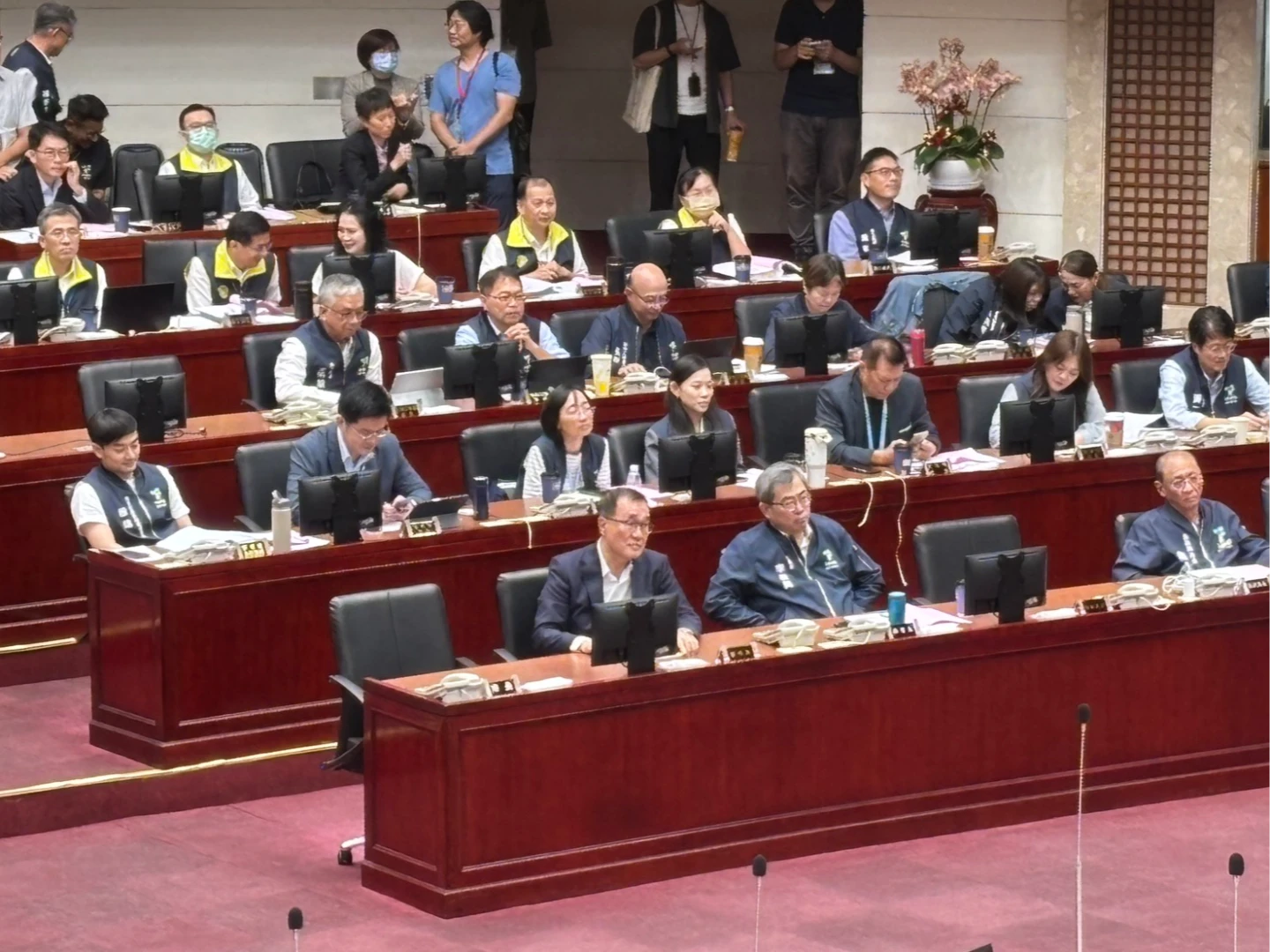 而議場今氣氛歡樂,藍綠白議員皆出席,綠營帶頭高喊「支持輝達,儘速簽約」、「國民黨議員沒跟著喊是假支持」,藍營則回應「感謝支持蔣市府」,綠營隨即高喊「是支持輝達」,現場爆出不少笑聲。
