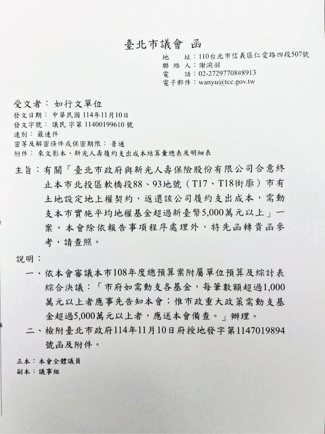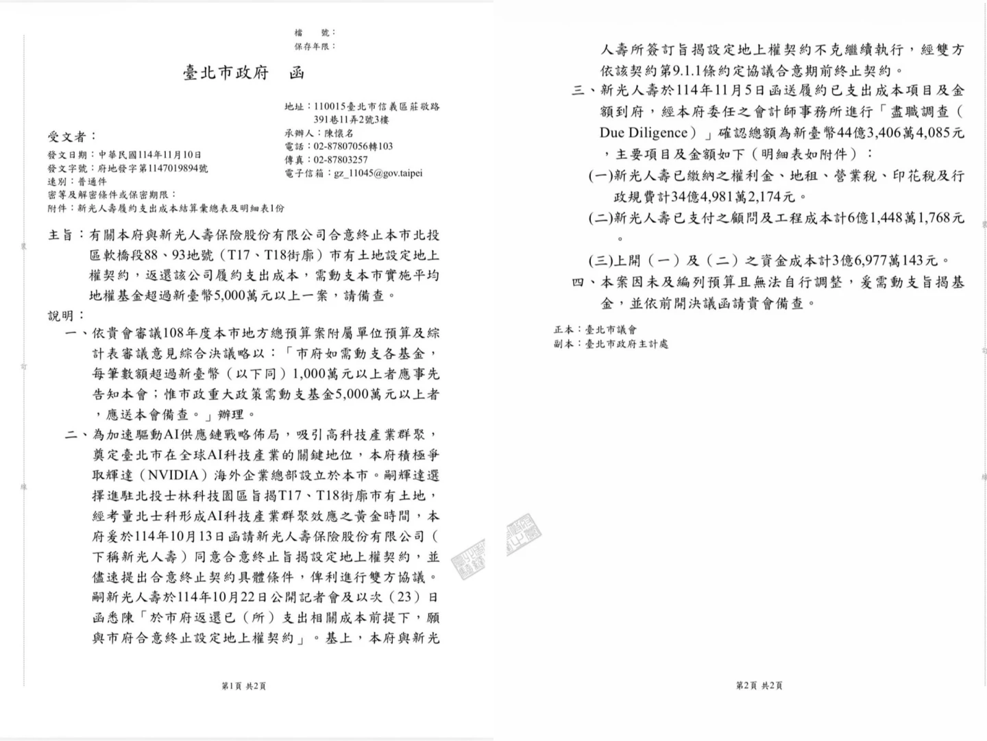 【記者許皓婷/台北報導】輝達台灣總部落腳北士科T17、T18基地,地主北市府和取得地上權的新光人壽合意解約,台北市副市長李四川表示,解約金談定為44.3億元,已將新壽解約書公文送進台北市議會審查,規劃14日與新壽簽訂終止契約。對此,台北市議長戴錫欽表示,議會將在今(12)日下午大會進行審議,並喊話,議員應展現最優質的議事效率,期盼周三就能完成備查程序,早日進入和輝達議約的實質程序。