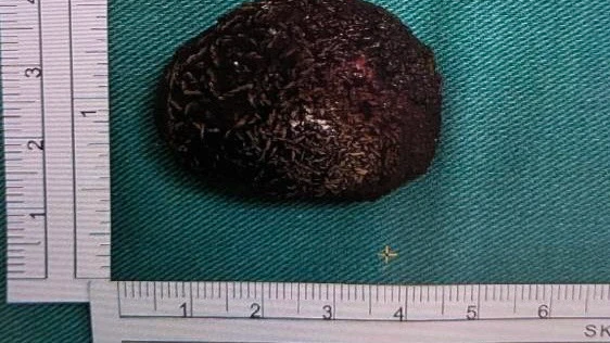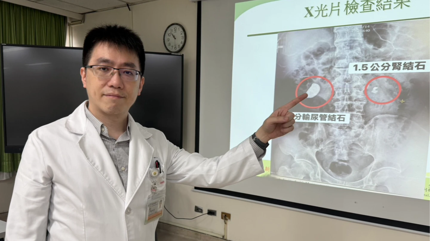 部立臺中醫院泌尿科醫師簡維弘表示,該名患者接受X光檢查後,在右側輸尿管與腎臟交界處清楚可見卡著一顆約4公分的巨大結石,左腎也有一顆約1.5公分結石,已造成明顯腎水腫,出現血尿與腰部痠痛等典型症狀,為避免腎臟功能進一步受損,立即安排右側輸尿管取石手術,並同步進行左腎體外震波碎石治療。
