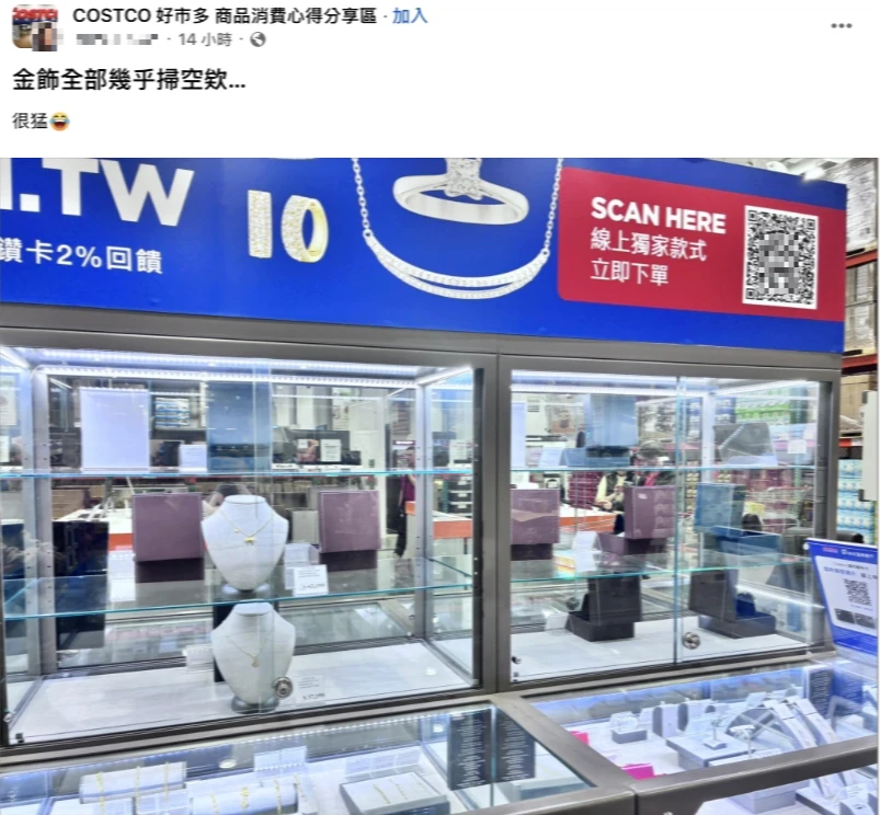 【記者陳力維/綜合報導】國際金價連兩日出現劇烈波動,連帶引發美式賣場好市多(Costco)會員的高度關注。有網友在「COSTCO 好市多 商品消費心得分享區」發文指出,賣場內的金飾幾乎全部被掃空,景象相當驚人。然而,面對金價在短短兩天內的大幅下跌,社群討論區內隨即出現一片哀號與檢討聲浪。許多網友直言,在高點進場的消費者「現在應該很後悔」、「今天買的應該睡不好了」,更有會員在討論區詢問「金崩跌,可賣回給costco嗎?」可不可以退貨?