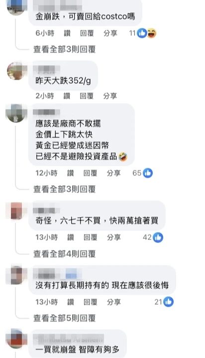 該社群內不少聲音嘲諷這是「韭菜」行為,指出一般民眾看到漲才追高,結果一買就崩盤,根本是「養套殺」,。也有內行網友分析,好市多的金價並未隨國際金價即時調整,部分價格甚至停留在半個月前,現在進場搶購反而可能買貴,直言「連跌兩天了」、「大跳水」、「現在被買等於廠商現賠,寧可囤貨」、「沒有打算長期持有的,現在應該很後悔」、「黃金已經變成迷因幣,已經不是避險投資產品」、「盤子,好市多只有金條可以買,飾品的工錢都嚇死人」。