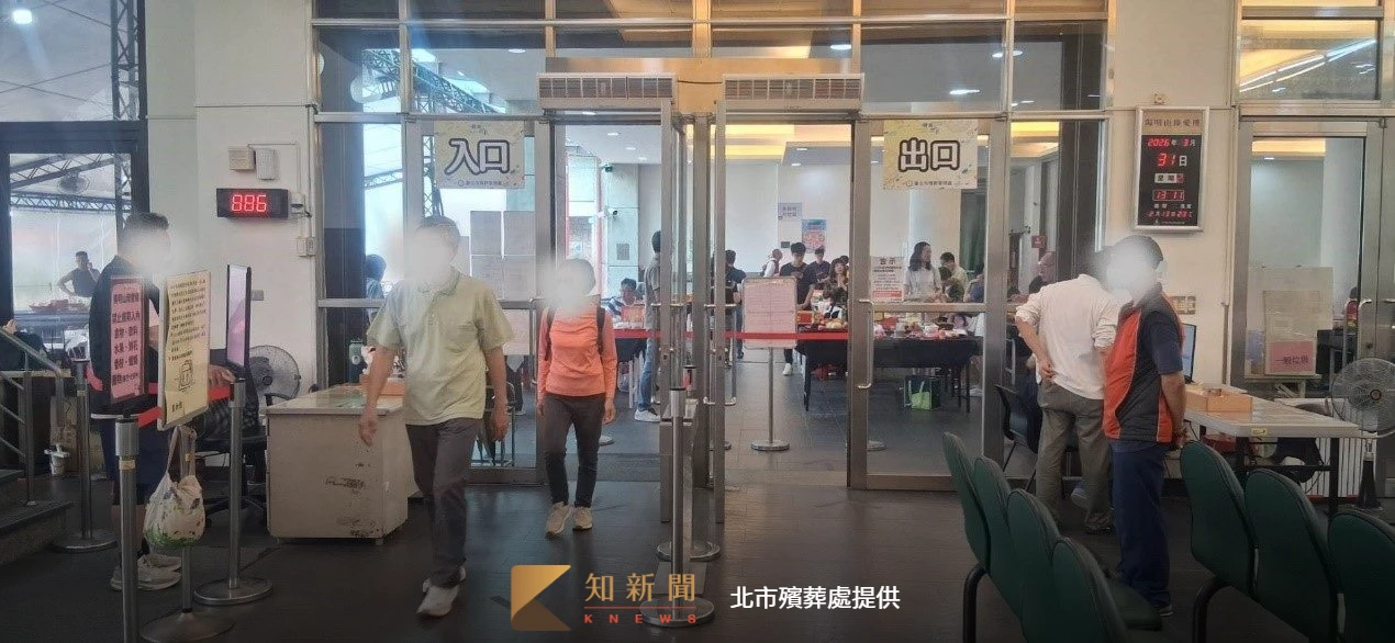 民眾進出臻愛樓,門口有本處人員管制大型包包或提袋進入臻愛樓。北市殯葬處提供 zoomin