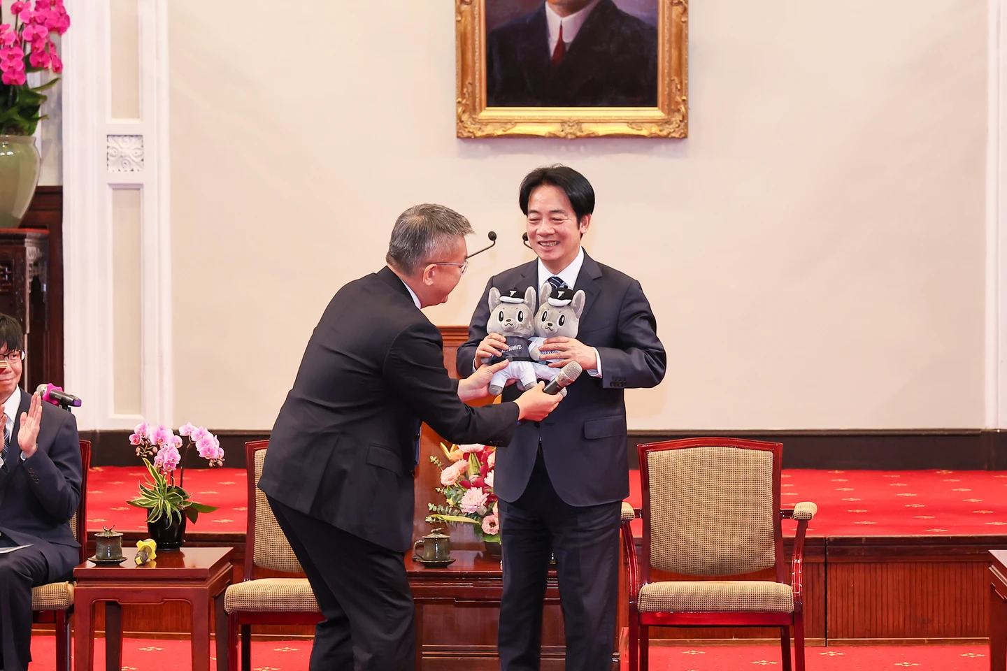 中職會長蔡其昌(左)送吉祥物「歐告」給總統賴清德。中職提供 zoomin
