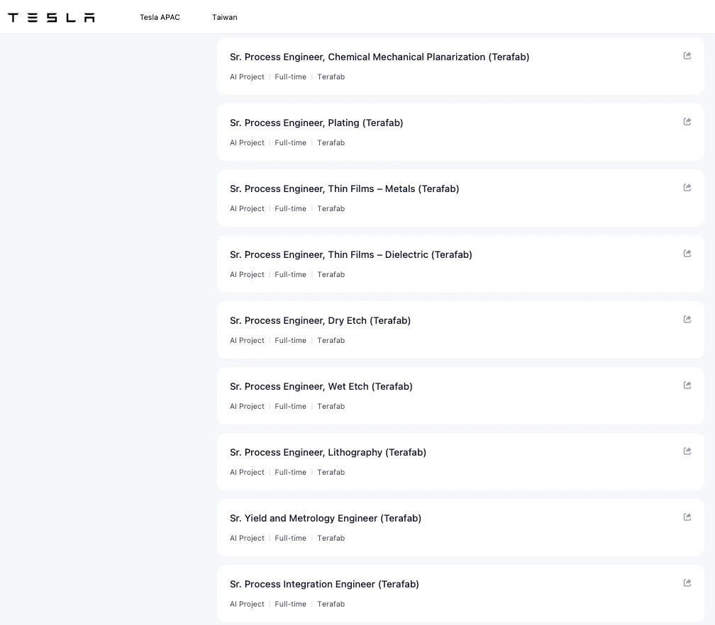 特斯拉官網替Terafab在台灣開出9大製程工程師職缺。取自Tesla