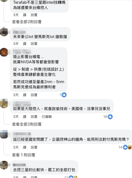 馬斯克Terafab挖角台積電引起網友熱議,有人認為這已經是國安問題了。取自臉書科技粉專「Angus電科技」