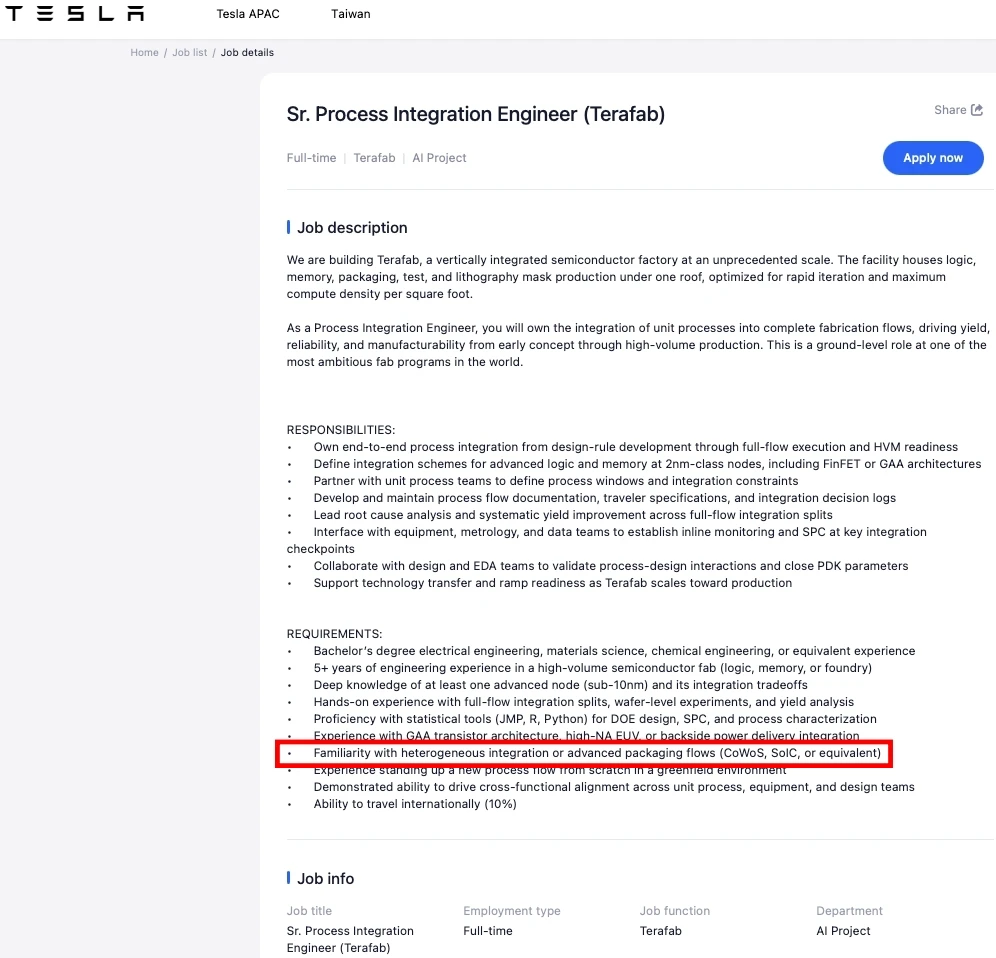 其中,「資深製程整合工程師(Sr. Process Integration Engineer)」職缺要求熟悉熟悉異質整合或高階封裝流程,如CoWoS、SoIC或同等產品(紅框處)。取自Tesla
