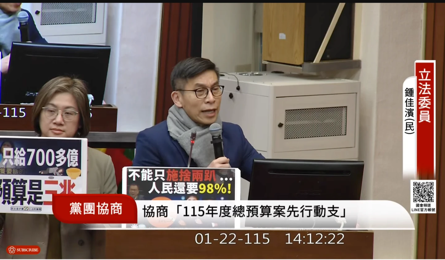 黨團發言時,民進黨團幹事長鍾佳濱指,今天處理的是一般提案,即便表決之後,115年度中央政府總預算仍然未交付審查,立法院一天不完成審議,今年度就沒有法定預算。按照在野黨要求,只先行動支718億38項,形同3兆0350億的中央政府總預算只先做了716億,其他98%凍結,他不能理解在野黨怎麼衡量挑出這38項,沒有審查,如何知道是優先項目,難道其他就不優先、不迫切嗎?