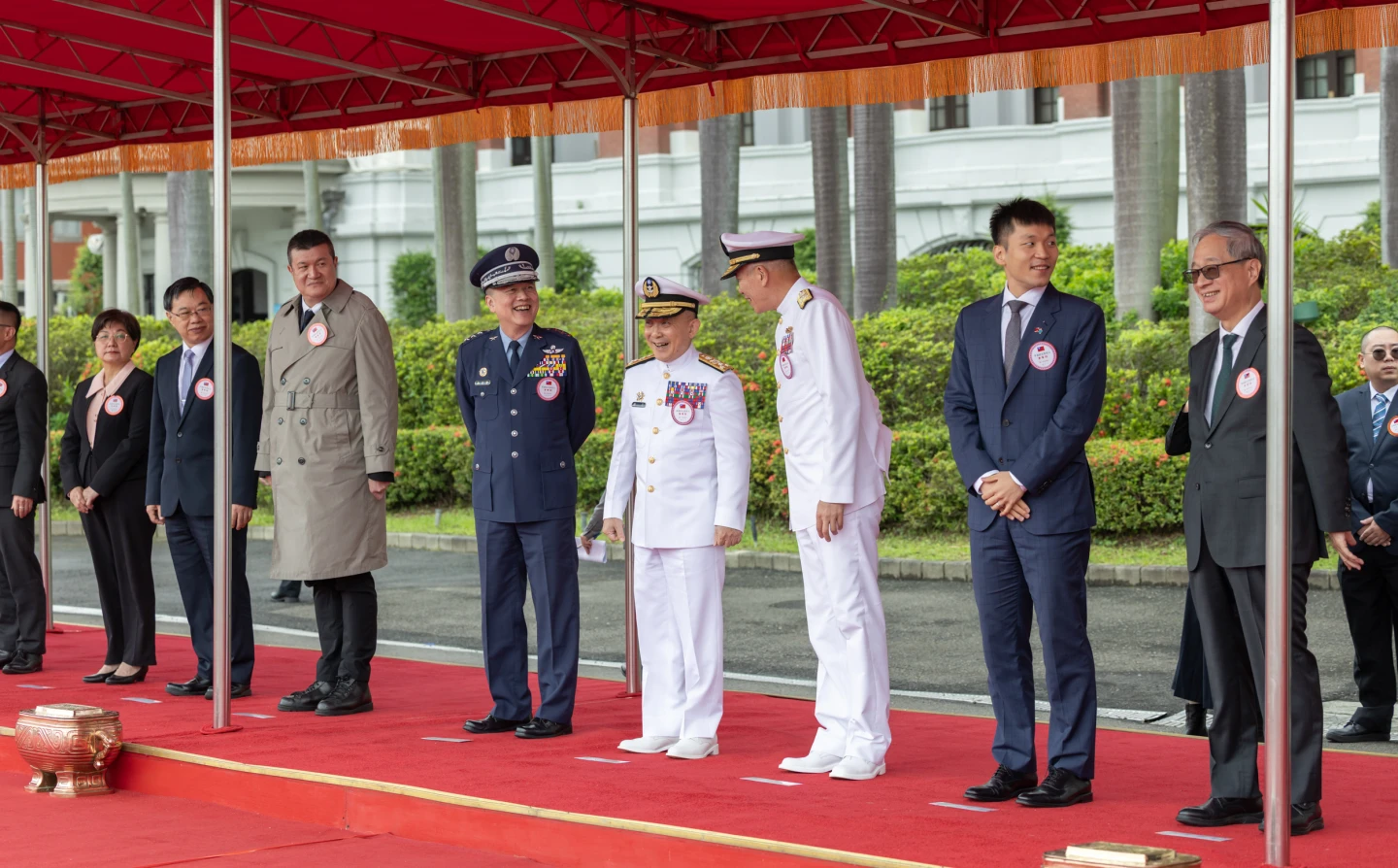 今日軍禮歡迎儀式,包括副總統蕭美琴、總統府秘書長潘孟安、國家安全會議秘書長吳釗燮、考試院長周弘憲、外交部長林佳龍、國防部長顧立雄、教育部長鄭英耀、農業部長陳駿季、文化部長李遠、運動部長李洋、吐瓦魯國駐台大使法莉莉(Lily Tangisia Faavae)、我駐吐瓦魯國大使林東亨及駐台使節團等出席。