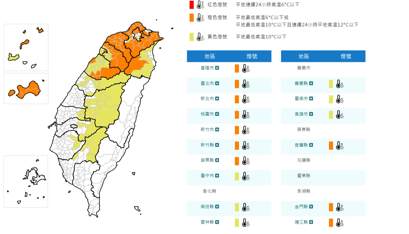 中央氣象署表示,強烈大陸冷氣團影響,中部以北及宜花天氣寒冷,其他地區早晚寒冷,今天清晨西半部及宜蘭低溫普遍是10-12℃,花東為14-15℃度,其中高雄以北、宜蘭及金、馬局部地區有10℃左右或以下氣溫發生的機率。預測白天北部及宜蘭高溫僅13-15℃,花東約16-18℃,中南部約20-21℃。