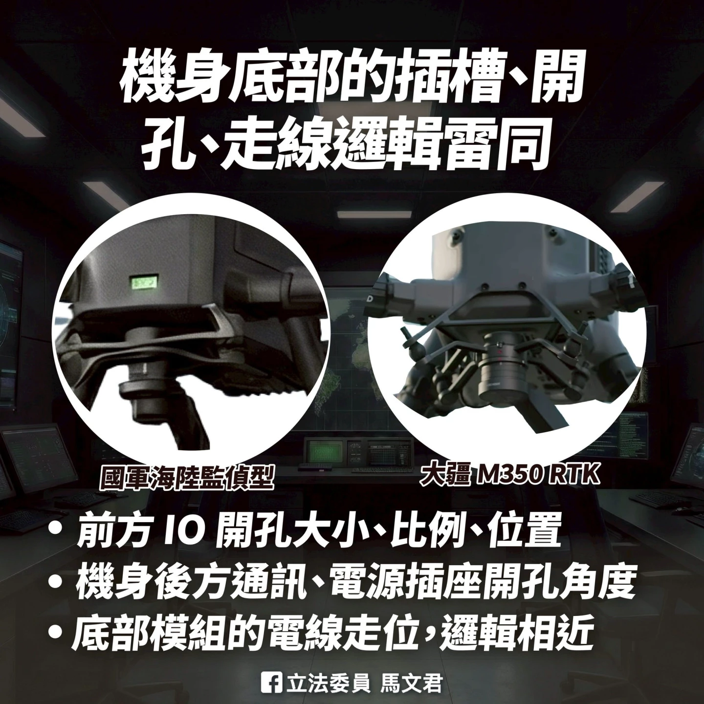 馬文君說,民眾陳情指出,這批國軍採購的「監偵型無人機」,其整體外型與結構配置,與中國大疆(DJI)Matrice 300/350 RTK 系列無人機高度相似,包括雲台快拆系統,大疆獨有的 SkyPort/SkyPort V2 設計,在接口尺寸比例、訊號觸點排列與三點式卡扣結構上,具有極高辨識性。然而,國軍採購之無人機,其雲台快拆系統在上述關鍵結構上,與大疆設計高度一致,已超出「功能需求相同」所能合理解釋的範圍。