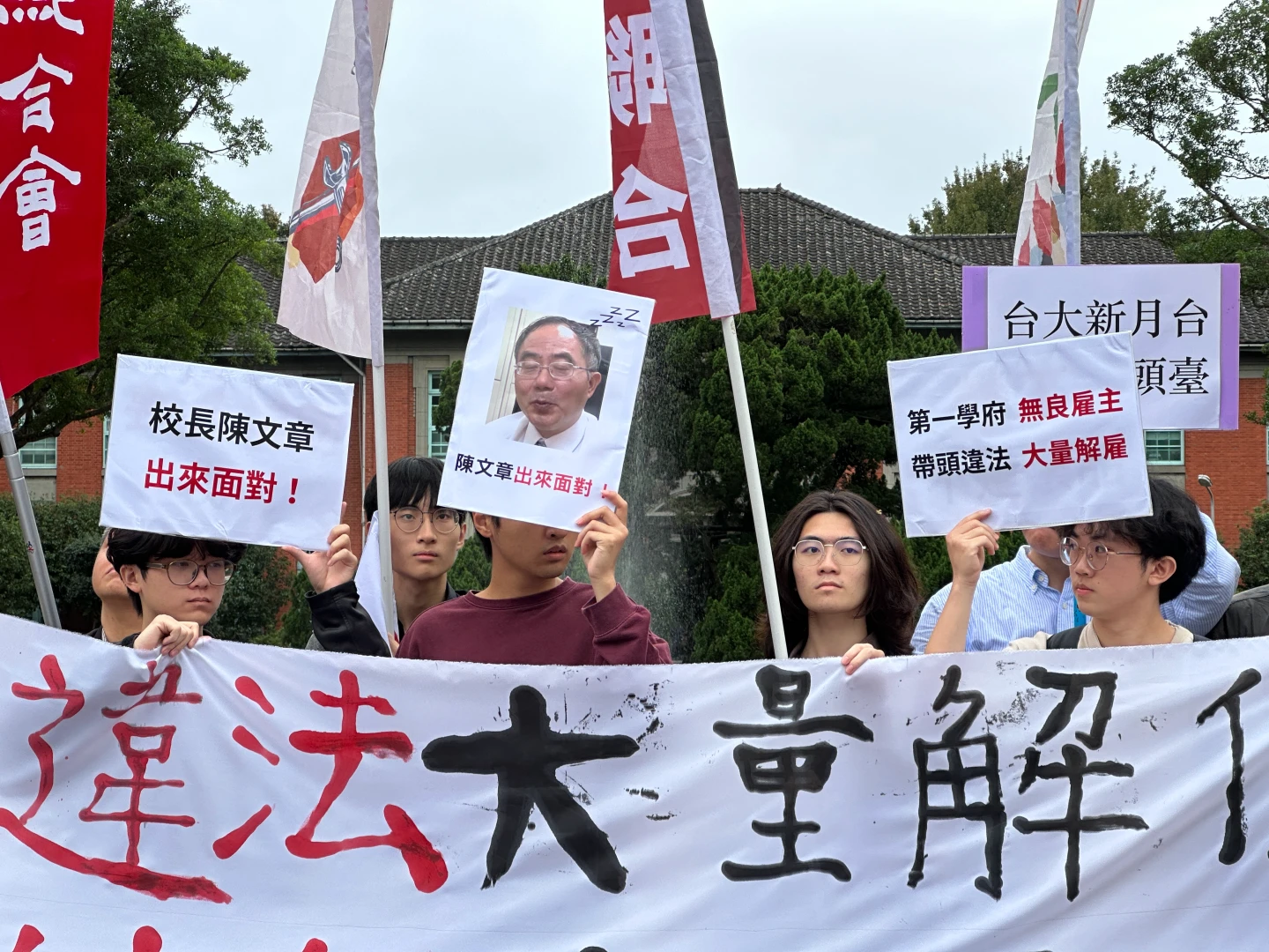高教工會今天在新月台前召開記者會,控訴新月台發生嚴重勞資爭議,身兼台大紀念品辦公室主任的副校長丁詩同、國際長袁孝維,大砍新月台人力,讓員工忙到無法吃飯,甚至還讓校外人士介入工作,員工提出勞檢並向校長陳文章陳情,卻反遭丁詩同趁著代理校長職務時違法解雇,怒批「新月台淪為勞權斷頭台」。