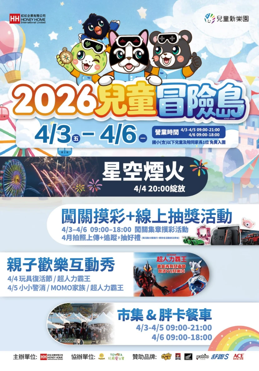而兒童新樂園推出多項優惠措施及主題活動,北捷遊憩公司指出,4月3日至6日兒童節暨清明節連假期間,全國國小(含)以下兒童凡持「2026兒童月探索摺頁」、數位學生證、學生證或健保卡等證明文件,即可享免費入園優惠,並可由1位家長陪同免費入園,讓親子家庭一同共享兒童節歡樂時光。