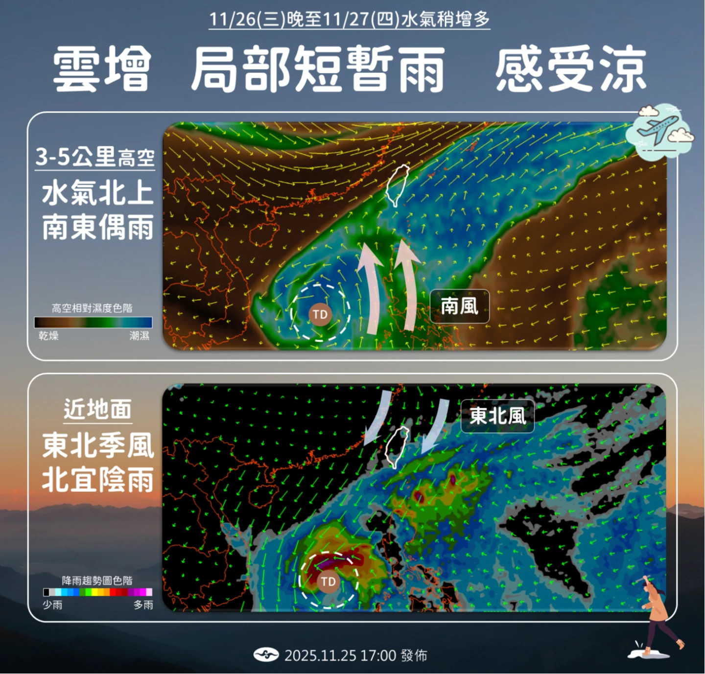 氣象署表示,明天依舊受到東北季風與高層水氣影響,北部與宜花持續陰雨、氣溫偏低;周五起水氣明顯減少,全台恢復多雲到晴,僅恆春半島偶見零星雨。周六、周日(29、30日)隨著東北季風減弱,白天氣溫回升,但清晨仍涼,西半部受輻射冷卻影響,清晨氣溫仍低,日夜溫差依然顯著,需適時調整穿著。