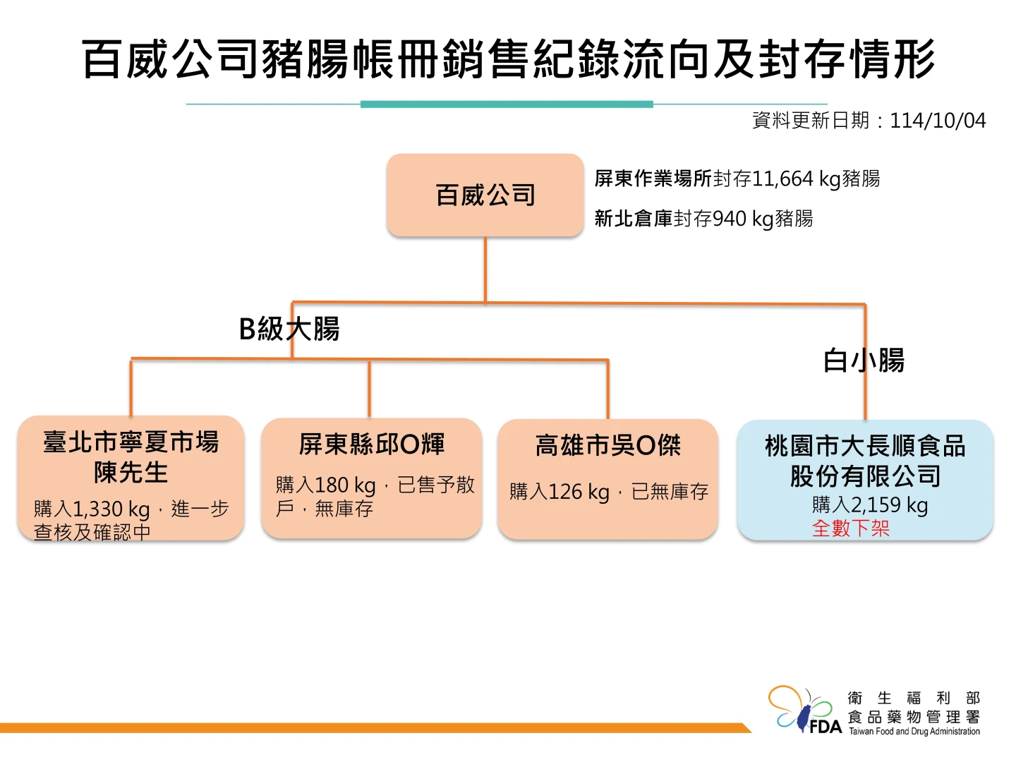 台北市為寧夏夜市陳先生購入1330公斤,正進一步查核及確認中;桃園大長順食品公司購入2159公斤,已全數下架;高雄吳O傑購入126公斤,已無庫存;屏東邱O輝購入180公斤,已售予散戶,無庫存。