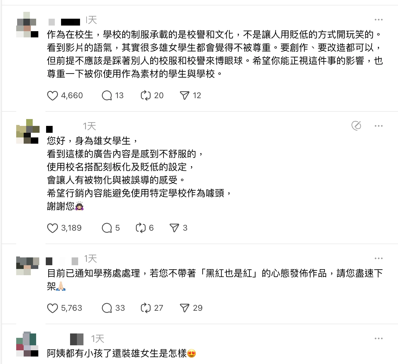 也有人表示:「身為雄女學生,看到這樣的廣告內容是感到不舒服的,使用校名搭配刻板化及貶低的設定,會讓人有被物化與被誤導的感受。希望行銷內容能避免使用特定學校作為噱頭!」、「雄女校友不同意,少來蹭!」、「都有小孩了還裝雄女生是怎樣」。